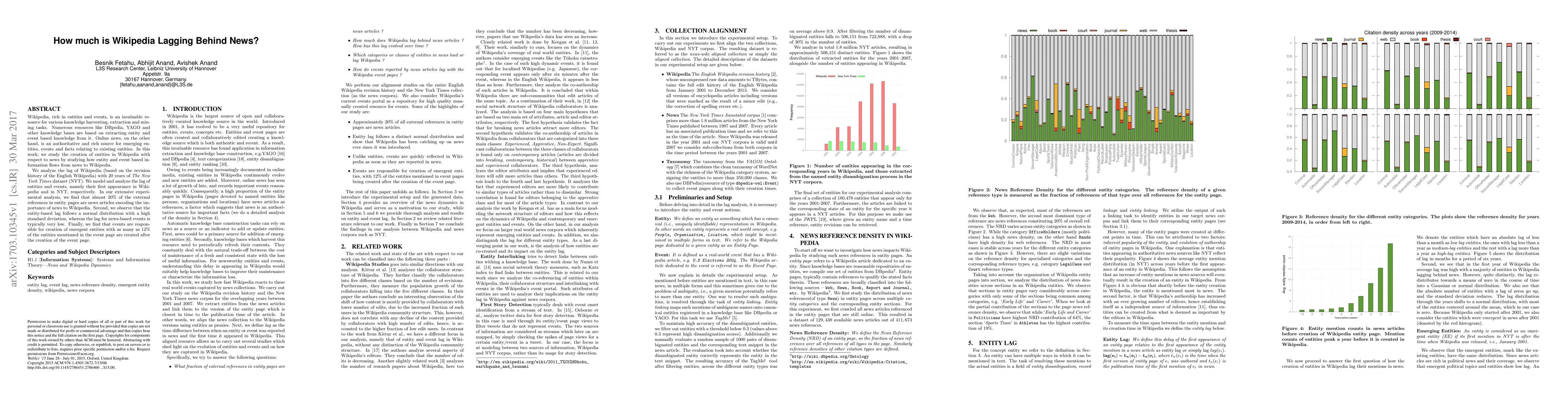 This study investigates the lag between Wikipedia and news sources like The New York Times in updating entity and event information. It finds that Wikipedia lags behind news by a variable amount, with a significant portion of its external references coming from news articles, and events often lead to the creation of new entities.