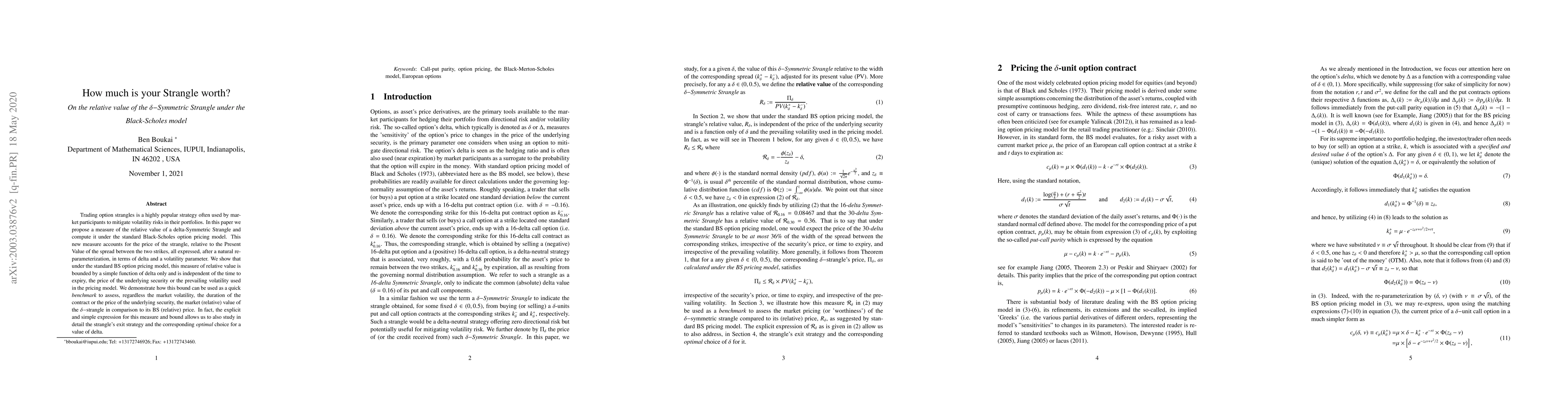 Trading option strangles is a highly popular strategy often used by market participants to mitigate volatility risks in their portfolios. In this paper we propose a measure of the relative value of a delta-Symmetric Strangle and compute it under the standard Black-Scholes option pricing model. This new measure accounts for the price of the strangle, relative to the Present Value of the spread between the two strikes, all expressed, after a natural re-parameterization, in terms of delta and a volatility parameter. We show that under the standard BS option pricing model, this measure of relative value is bounded by a simple function of delta only and is independent of the time to expiry, the price of the underlying security or the prevailing volatility used in the pricing model. We demonstrate how this bound can be used as a quick {\it benchmark} to assess, regardless the market volatility, the duration of the contract or the price of the underlying security, the market (relative) value of the $\delta-$strangle in comparison to its BS (relative) price. In fact, the explicit and simple expression for this measure and bound allows us to also study in detail the strangle's exit strategy and the corresponding {\it optimal} choice for a value of delta.