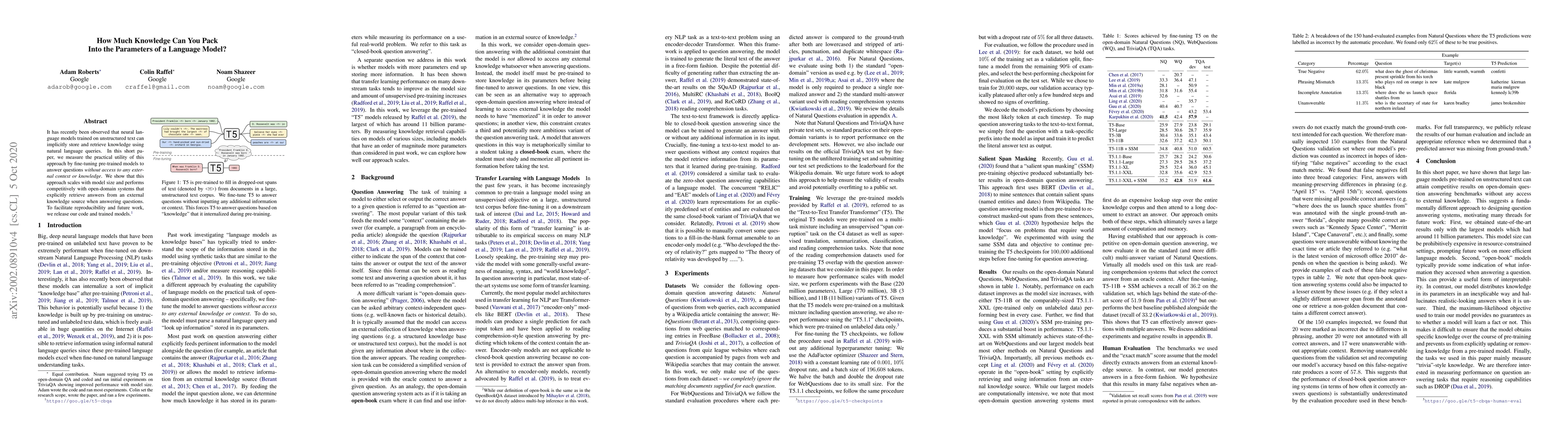 This research fine-tunes pre-trained language models (T5) on closed-book question answering tasks without external knowledge access. Models are evaluated on Natural Questions, Web Questions, and Trivia QA datasets.