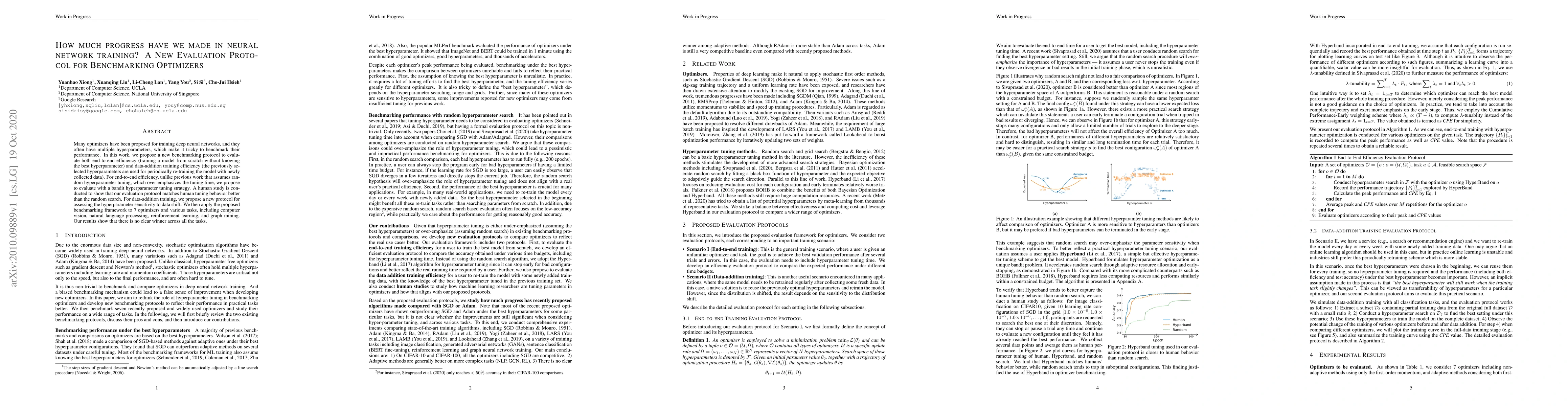 Many optimizers have been proposed for training deep neural networks, and they often have multiple hyperparameters, which make it tricky to benchmark their performance. In this work, we propose a new benchmarking protocol to evaluate both end-to-end efficiency (training a model from scratch without knowing the best hyperparameter) and data-addition training efficiency (the previously selected hyperparameters are used for periodically re-training the model with newly collected data). For end-to-end efficiency, unlike previous work that assumes random hyperparameter tuning, which over-emphasizes the tuning time, we propose to evaluate with a bandit hyperparameter tuning strategy. A human study is conducted to show that our evaluation protocol matches human tuning behavior better than the random search. For data-addition training, we propose a new protocol for assessing the hyperparameter sensitivity to data shift. We then apply the proposed benchmarking framework to 7 optimizers and various tasks, including computer vision, natural language processing, reinforcement learning, and graph mining. Our results show that there is no clear winner across all the tasks.