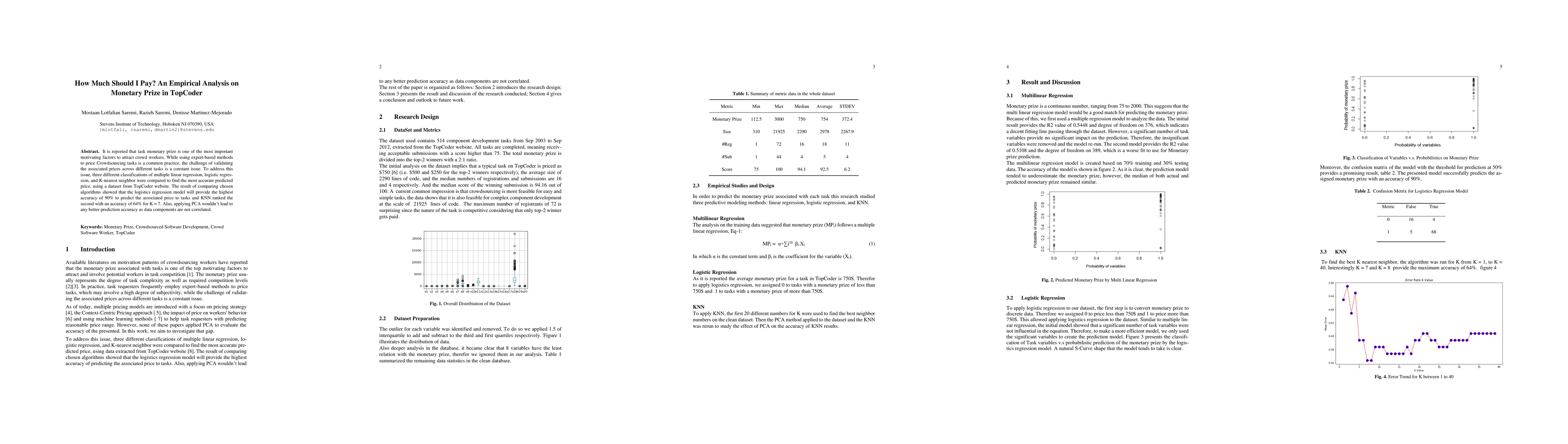 This study empirically analyzes the monetary prize for crowdsourcing tasks on TopCoder, finding logistic regression to be the most accurate method for predicting task prices with 90% accuracy, while K-nearest neighbor (KNN) ranked second with 64% accuracy for K=7. PCA did not improve prediction accuracy due to lack of data correlation.