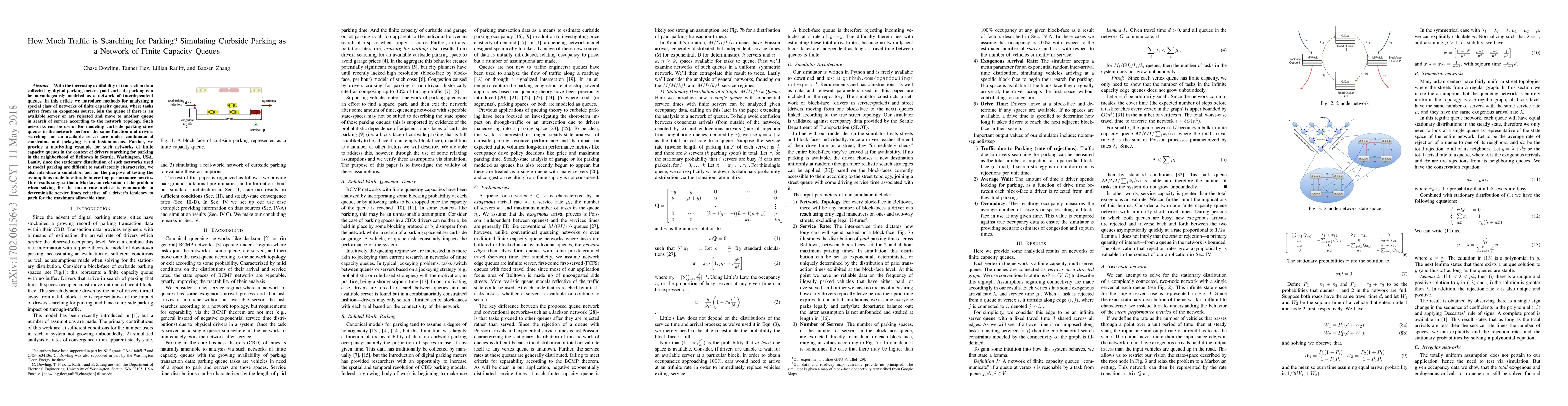 This paper models paid curbside parking as a network of finite capacity queues, analyzing how drivers search for parking spaces using simulation methods. It introduces a simulation tool to estimate performance metrics, finding that a Markovian approach approximates drivers' behavior in parking duration.