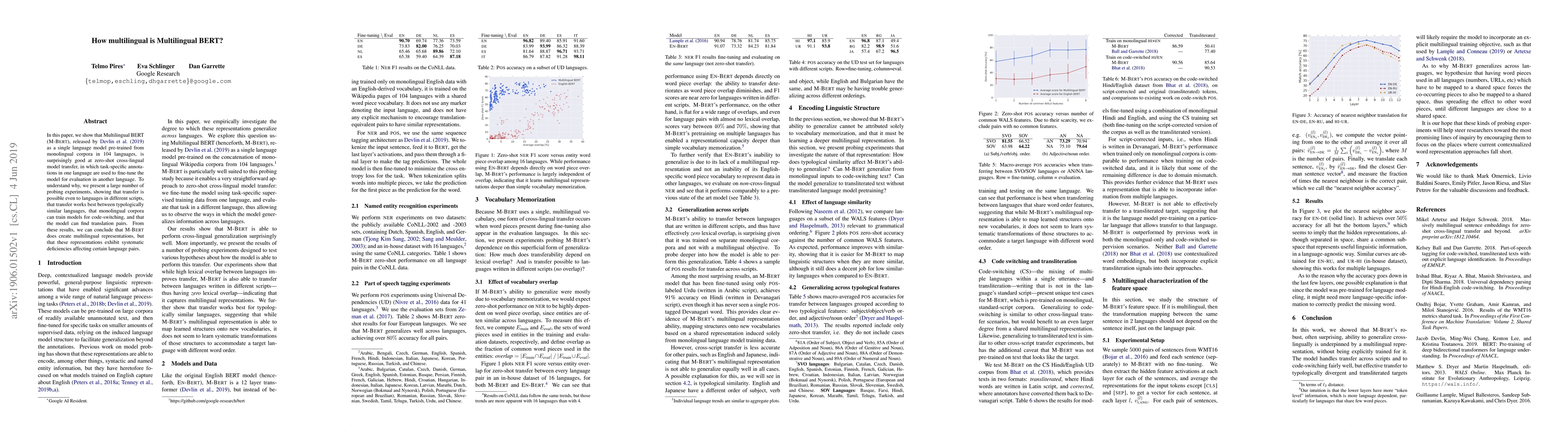 In this paper, we show that Multilingual BERT (M-BERT), released by Devlin et al. (2018) as a single language model pre-trained from monolingual corpora in 104 languages, is surprisingly good at zero-shot cross-lingual model transfer, in which task-specific annotations in one language are used to fine-tune the model for evaluation in another language. To understand why, we present a large number of probing experiments, showing that transfer is possible even to languages in different scripts, that transfer works best between typologically similar languages, that monolingual corpora can train models for code-switching, and that the model can find translation pairs. From these results, we can conclude that M-BERT does create multilingual representations, but that these representations exhibit systematic deficiencies affecting certain language pairs.