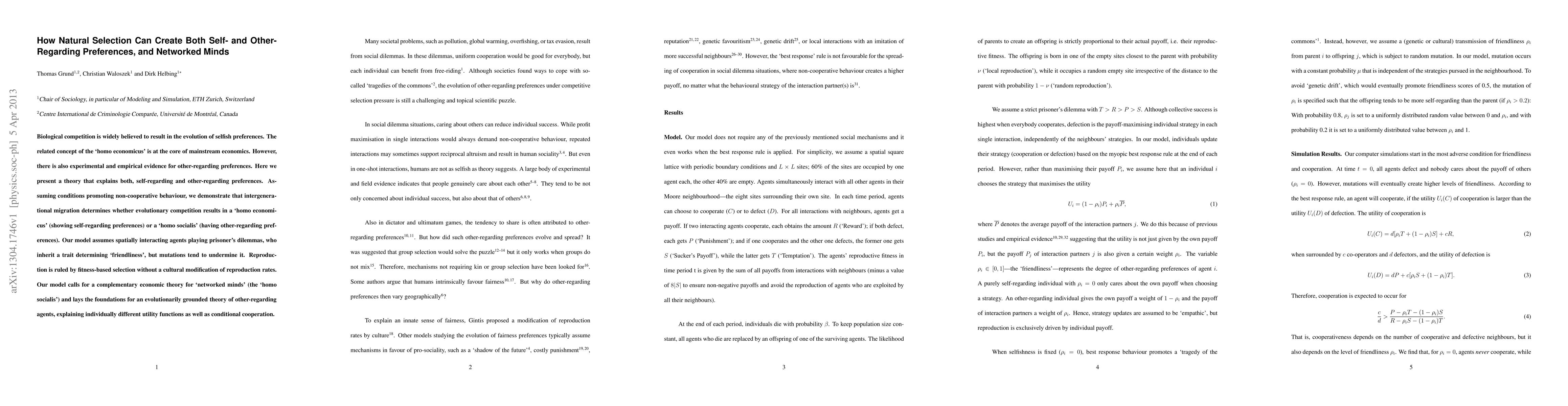 This paper presents a theory explaining the evolution of both self- and other-regarding preferences through natural selection, showing how intergenerational migration influences whether individuals develop selfish or cooperative traits. The model introduces "networked minds" to complement economic theory, explaining diverse utility functions and conditional cooperation.