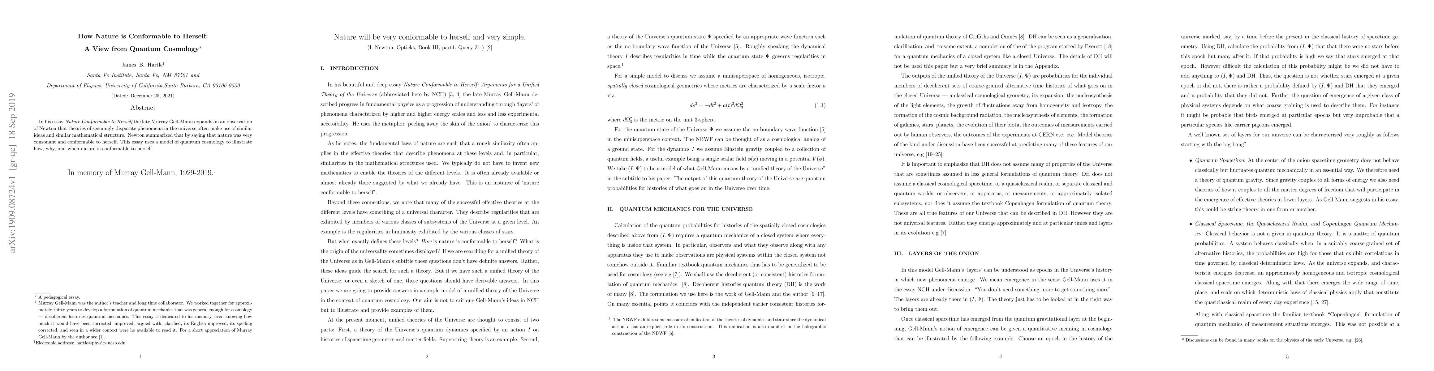 In his essay "Nature Conformable to Herself" the late Murray Gell-Mann expands on an observation of Newton that theories of seemingly disparate phenomena in the universe often make use of similar ideas and similar mathematical structure. Newton summarized that by saying that nature was very consonant and conformable to herself. This essay uses a model of quantum cosmology to illustrate how, why, and when nature is conformable to herself.