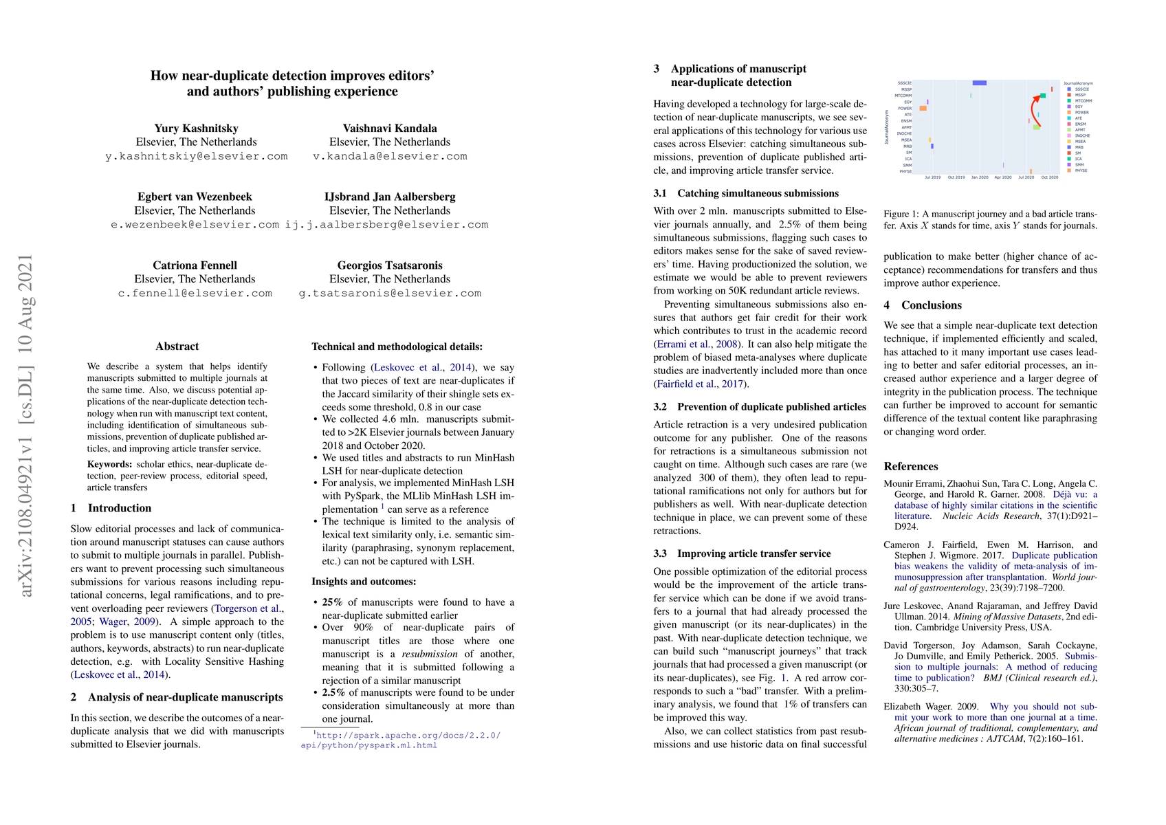 We describe a system that helps identify manuscripts submitted to multiple journals at the same time. Also, we discuss potential applications of the near-duplicate detection technology when run with manuscript text content, including identification of simultaneous submissions, prevention of duplicate published articles, and improving article transfer service.