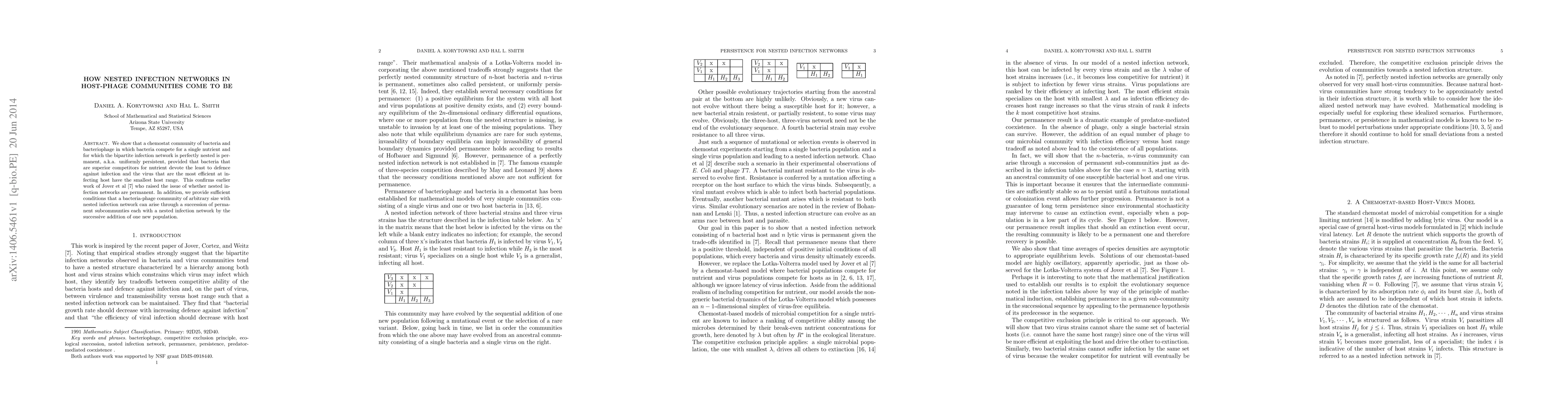 This paper demonstrates that nested infection networks in host-phage communities are permanent if superior bacterial competitors invest less in defense and viruses with the smallest host range are most efficient. It also provides conditions for the emergence of nested networks through the addition of new populations.