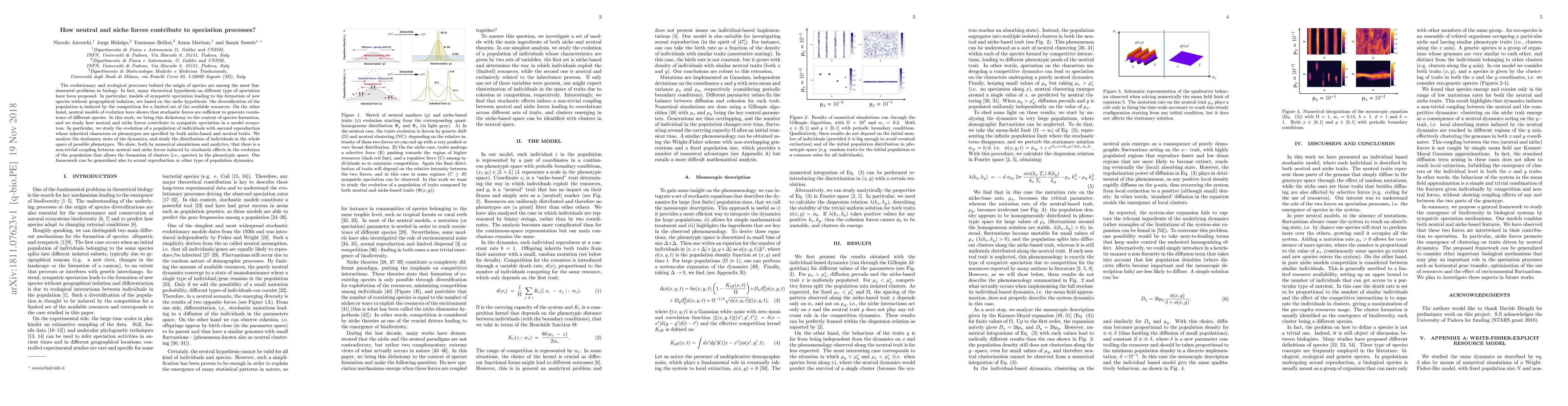 This paper explores how neutral evolutionary forces and niche-based ecological interactions contribute to sympatric speciation. It demonstrates through simulations and analytics that stochastic effects can create a coupling between these forces, leading to the formation of distinct species clusters in phenotypic space.