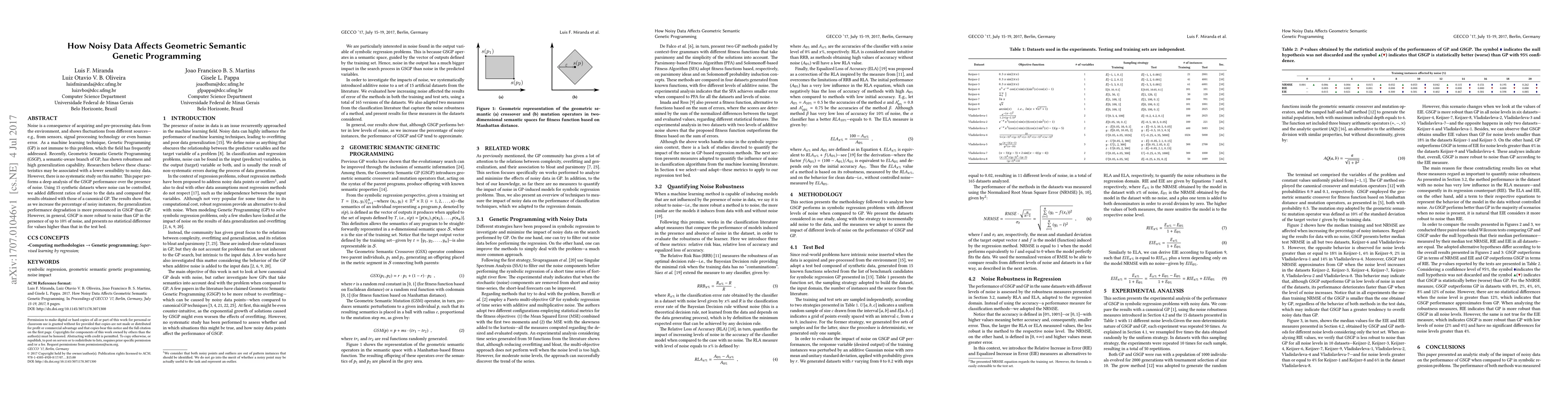 This paper investigates how noise affects Geometric Semantic Genetic Programming (GSGP) compared to canonical Genetic Programming (GP). Results from synthetic datasets show that GSGP is more robust to noise up to 10%, but its performance degrades faster than GP when noise levels exceed this threshold.