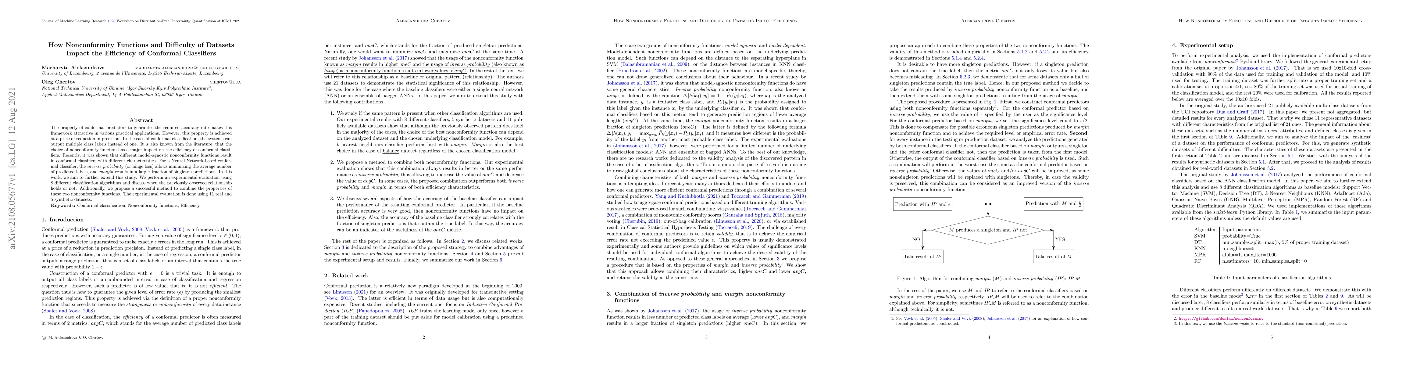 The property of conformal predictors to guarantee the required accuracy rate makes this framework attractive in various practical applications. However, this property is achieved at a price of reduction in precision. In the case of conformal classification, the systems can output multiple class labels instead of one. It is also known from the literature, that the choice of nonconformity function has a major impact on the efficiency of conformal classifiers. Recently, it was shown that different model-agnostic nonconformity functions result in conformal classifiers with different characteristics. For a Neural Network-based conformal classifier, the inverse probability (or hinge loss) allows minimizing the average number of predicted labels, and margin results in a larger fraction of singleton predictions. In this work, we aim to further extend this study. We perform an experimental evaluation using 8 different classification algorithms and discuss when the previously observed relationship holds or not. Additionally, we propose a successful method to combine the properties of these two nonconformity functions. The experimental evaluation is done using 11 real and 5 synthetic datasets.