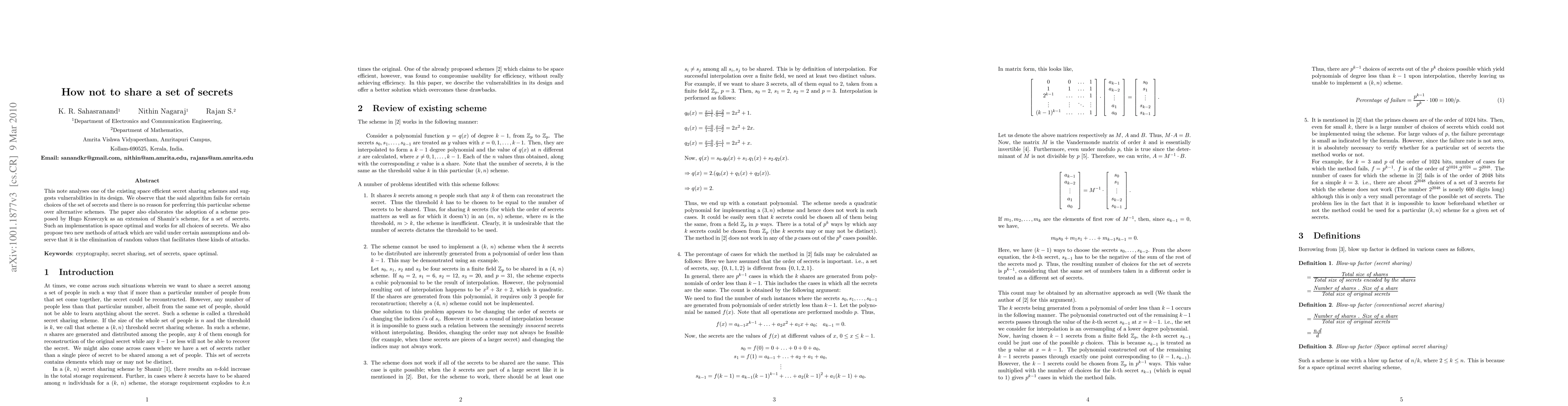 This note analyses one of the existing space efficient secret sharing schemes and suggests vulnerabilities in its design. We observe that the said algorithm fails for certain choices of the set of secrets and there is no reason for preferring this particular scheme over alternative schemes. The paper also elaborates the adoption of a scheme proposed by Hugo Krawczyk as an extension of Shamir's scheme, for a set of secrets. Such an implementation is space optimal and works for all choices of secrets. We also propose two new methods of attack which are valid under certain assumptions and observe that it is the elimination of random values that facilitates these kinds of attacks.