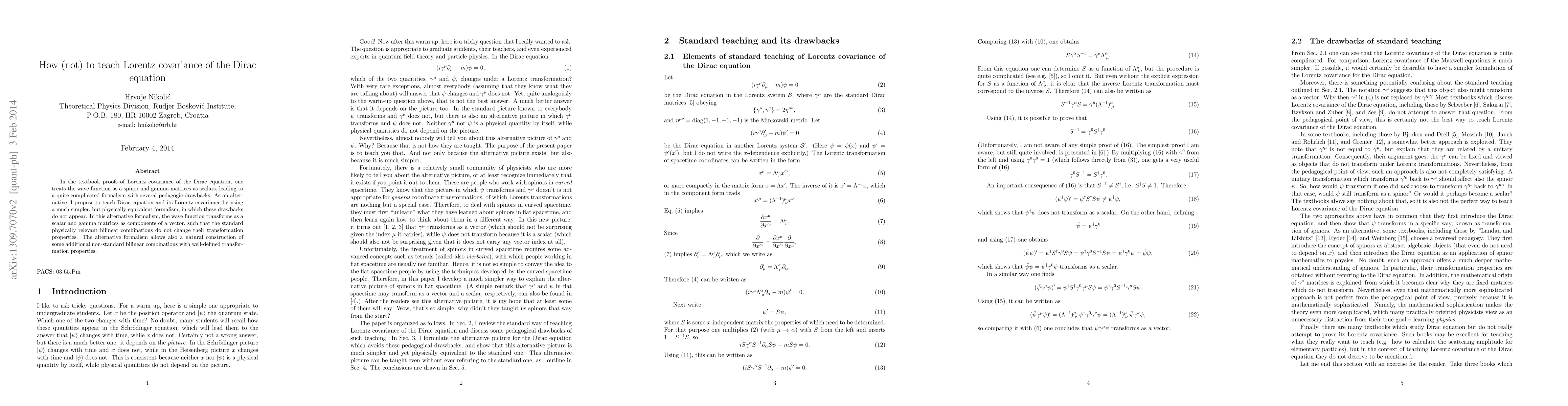 This paper proposes a simpler approach to teaching the Lorentz covariance of the Dirac equation, avoiding the complicated formalism of traditional methods. Instead, it suggests treating the wave function as a scalar and gamma matrices as vector components, which eliminates pedagogic drawbacks and allows for a clearer understanding of the equation's covariance.