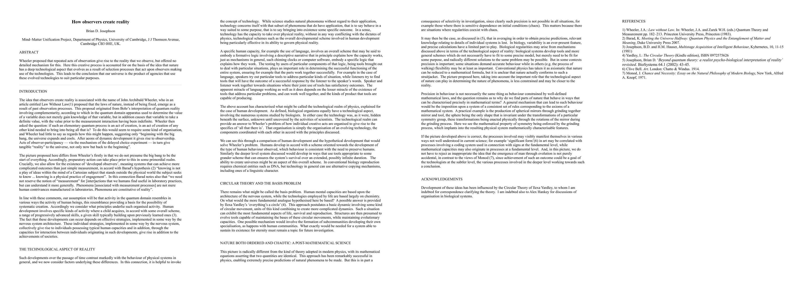 The paper proposes a mechanism for Wheeler's observation-driven reality creation, suggesting that nature has a technological aspect that evolves via selection processes acting on observers using technologies.