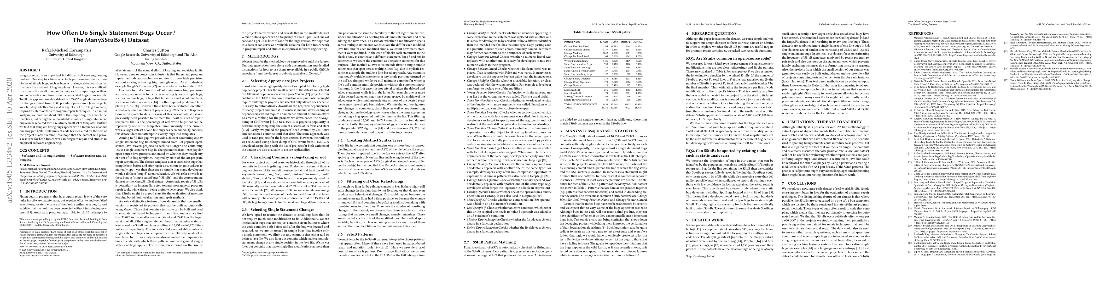 A new dataset of 153,652 single statement bug-fix changes is released, showing that about 33% of simple bug fixes match a set of templates, indicating many can be repaired with a small set of templates.
