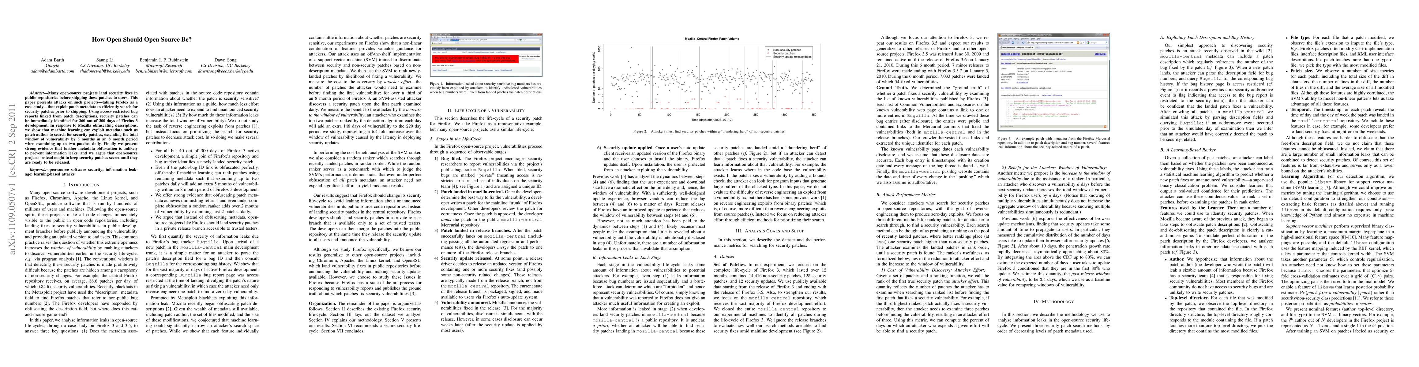 Many open-source projects land security fixes in public repositories before shipping these patches to users. This paper presents attacks on such projects - taking Firefox as a case-study - that exploit patch metadata to efficiently search for security patches prior to shipping. Using access-restricted bug reports linked from patch descriptions, security patches can be immediately identified for 260 out of 300 days of Firefox 3 development. In response to Mozilla obfuscating descriptions, we show that machine learning can exploit metadata such as patch author to search for security patches, extending the total window of vulnerability by 5 months in an 8 month period when examining up to two patches daily. Finally we present strong evidence that further metadata obfuscation is unlikely to prevent information leaks, and we argue that open-source projects instead ought to keep security patches secret until they are ready to be released.