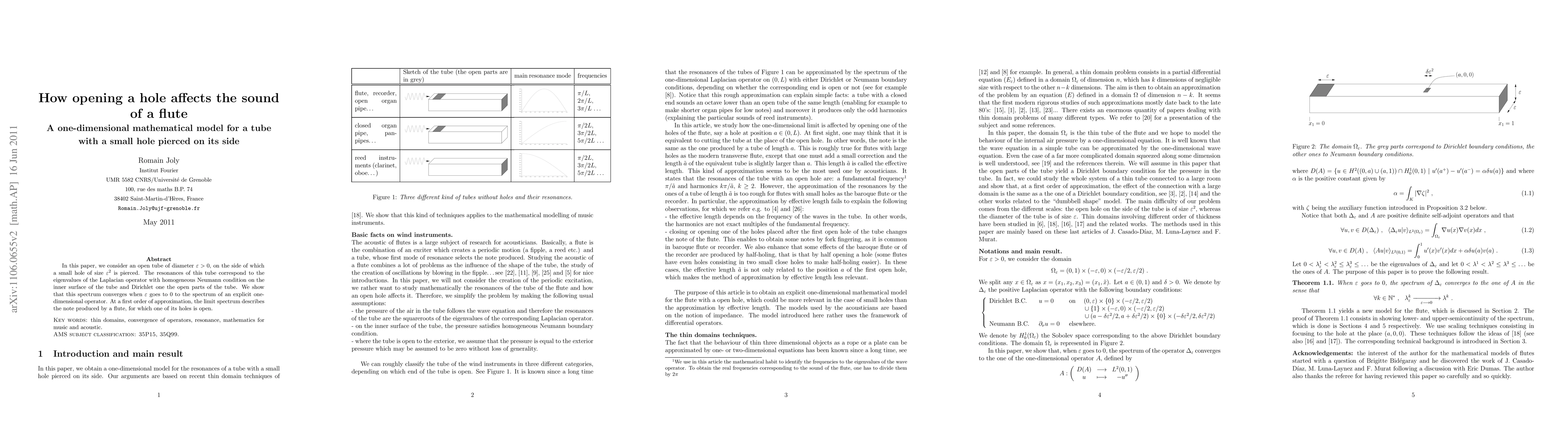 This paper investigates how opening a hole in a flute affects its sound, finding that as the hole size approaches zero, it converges to the spectrum of a one-dimensional operator that describes a flute's note.