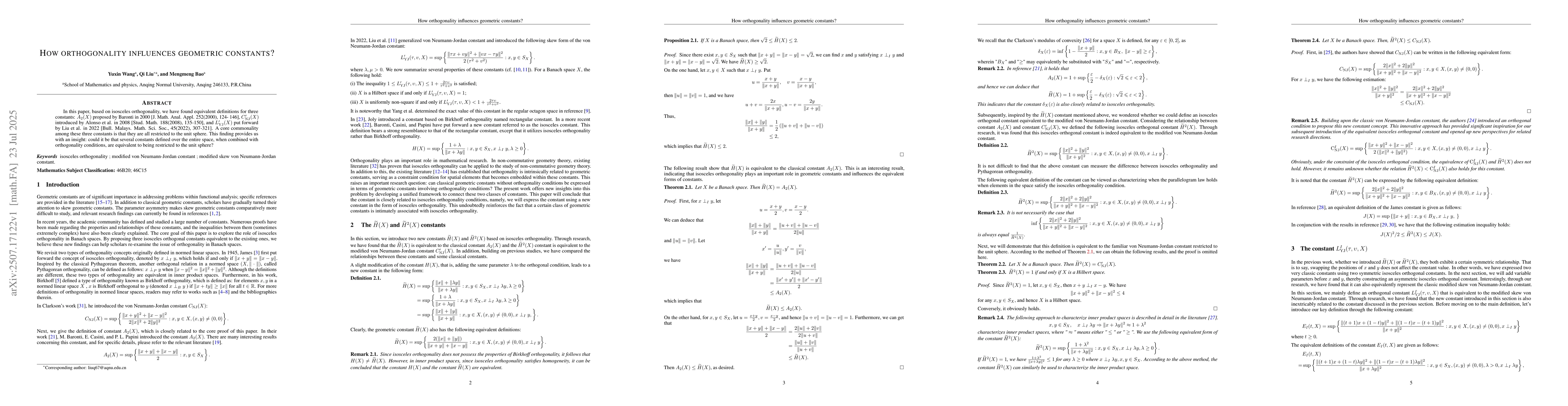 In this paper, based on isosceles orthogonality, we have found equivalent definitions for three constants: A2(X) proposed by Baronti in 2000 [J. Math. Anal. Appl. 252(2000), 124- 146], CNJ(X) introduced by Alonso et al. in 2008 [Stud. Math. 188(2008), 135-150], and LYJ(X) put forward by Liu et al. in 2022 [Bull. Malays. Math. Sci. Soc., 45(2022), 307-321]. A core commonality among these three constants is that they are all restricted to the unit sphere. This finding provides us with an insight: could it be that several constants defined over the entire space, when combined with orthogonality conditions, are equivalent to being restricted to the unit sphere?