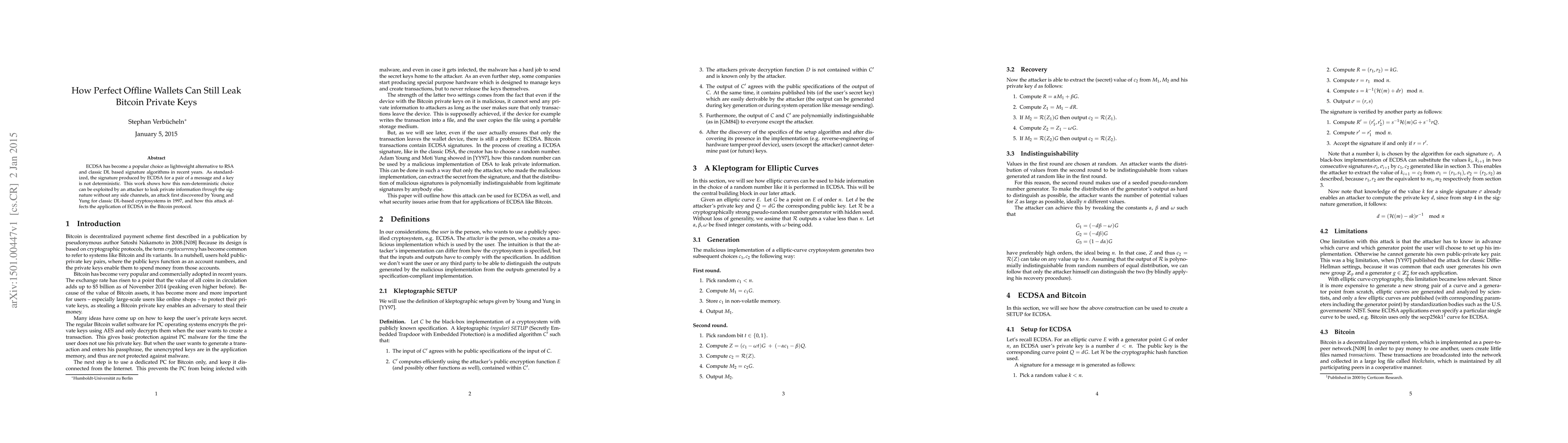 ECDSA has become a popular choice as lightweight alternative to RSA and classic DL based signature algorithms in recent years. As standardized, the signature produced by ECDSA for a pair of a message and a key is not deterministic. This work shows how this non-deterministic choice can be exploited by an attacker to leak private information through the signature without any side channels, an attack first discovered by Young and Yung for classic DL-based cryptosystems in 1997, and how this attack affects the application of ECDSA in the Bitcoin protocol.