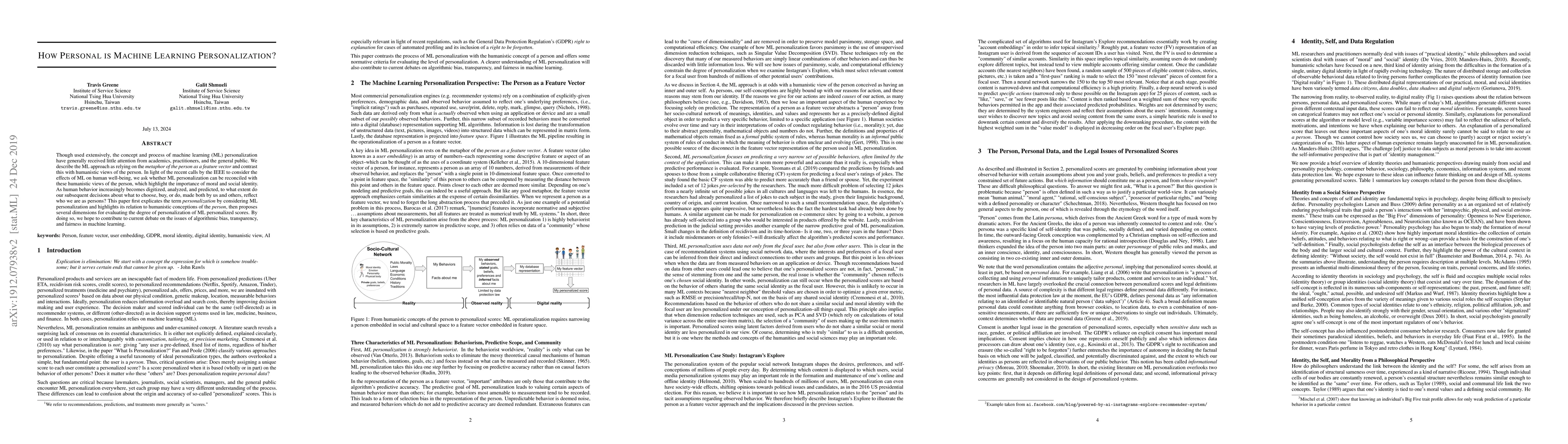 Though used extensively, the concept and process of machine learning (ML) personalization have generally received little attention from academics, practitioners, and the general public. We describe the ML approach as relying on the metaphor of the person as a feature vector and contrast this with humanistic views of the person. In light of the recent calls by the IEEE to consider the effects of ML on human well-being, we ask whether ML personalization can be reconciled with these humanistic views of the person, which highlight the importance of moral and social identity. As human behavior increasingly becomes digitized, analyzed, and predicted, to what extent do our subsequent decisions about what to choose, buy, or do, made both by us and others, reflect who we are as persons? This paper first explicates the term personalization by considering ML personalization and highlights its relation to humanistic conceptions of the person, then proposes several dimensions for evaluating the degree of personalization of ML personalized scores. By doing so, we hope to contribute to current debate on the issues of algorithmic bias, transparency, and fairness in machine learning.
