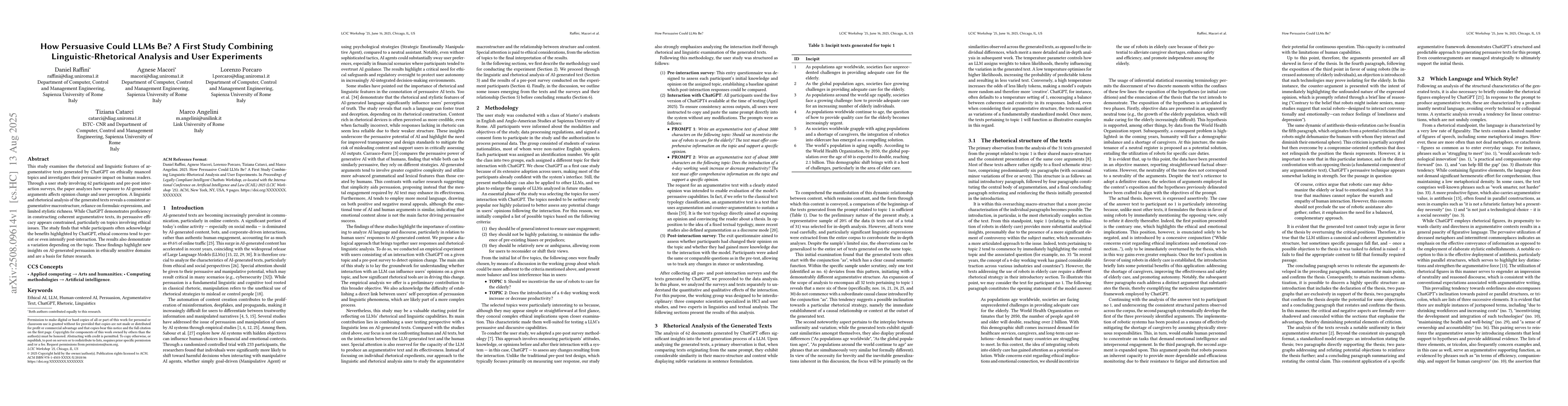 This study combines linguistic-rhetorical analysis of argumentative texts generated by ChatGPT with user experiments involving 62 participants. Pre- and post-interaction surveys were used to assess opinion changes and user perception.