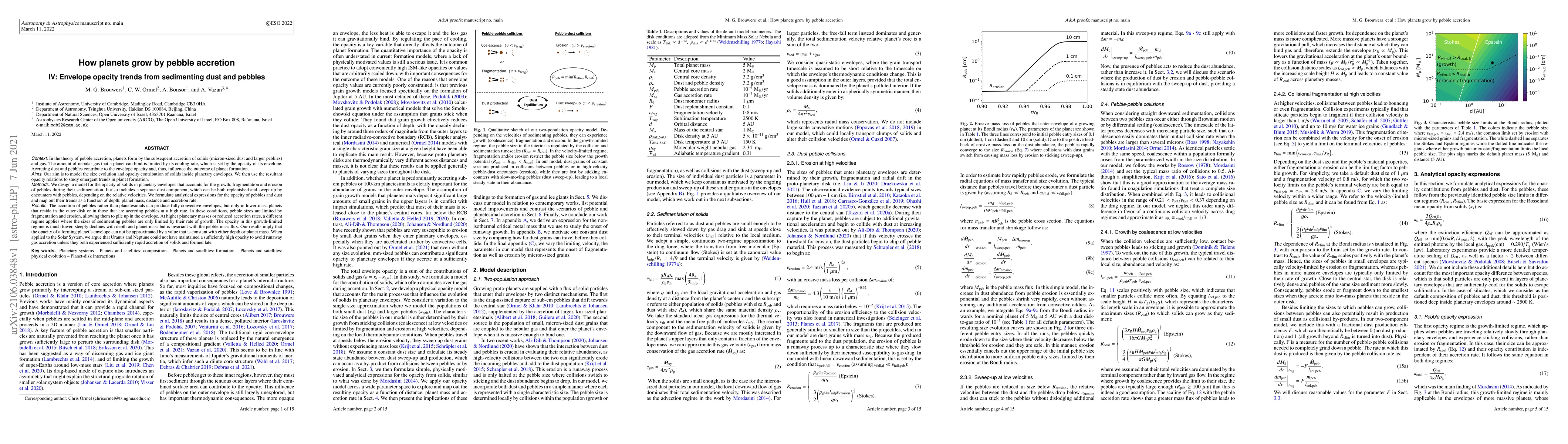 The amount of nebular gas that a planet can bind is limited by its cooling rate, which is set by the opacity of its envelope. Accreting dust and pebbles contribute to the envelope opacity and, thus, influence the outcome of planet formation. Our aim is to model the size evolution and opacity contribution of solids inside planetary envelopes. We then use the resultant opacity relations to study emergent trends in planet formation. We design a model for the opacity of solids in planetary envelopes that accounts for the growth, fragmentation and erosion of pebbles during their sedimentation. We formulate analytical expressions for the opacity of pebbles and dust and map out their trends as a function of depth, planet mass, distance and accretion rate. We find that the accretion of pebbles rather than planetesimals can produce fully convective envelopes, but only in lower-mass planets that reside in the outer disk or in those that are accreting pebbles at a high rate. In these conditions, pebble sizes are limited by fragmentation and erosion, allowing them to pile up in the envelope. At higher planetary masses or reduced accretion rates, a different regime applies where the sizes of sedimenting pebbles are only limited by their rate of growth. The opacity in this growth-limited regime is much lower, steeply declines with depth and planet mass but is invariant with the pebble mass flux. Our results imply that the opacity of a forming planetary envelope can not be approximated by a value that is constant with either depth or planet mass. When applied to the Solar System, we argue that Uranus and Neptune could not have maintained a sufficiently high opacity to avoid runaway gas accretion unless they both experienced sufficiently rapid accretion of solids and formed late.