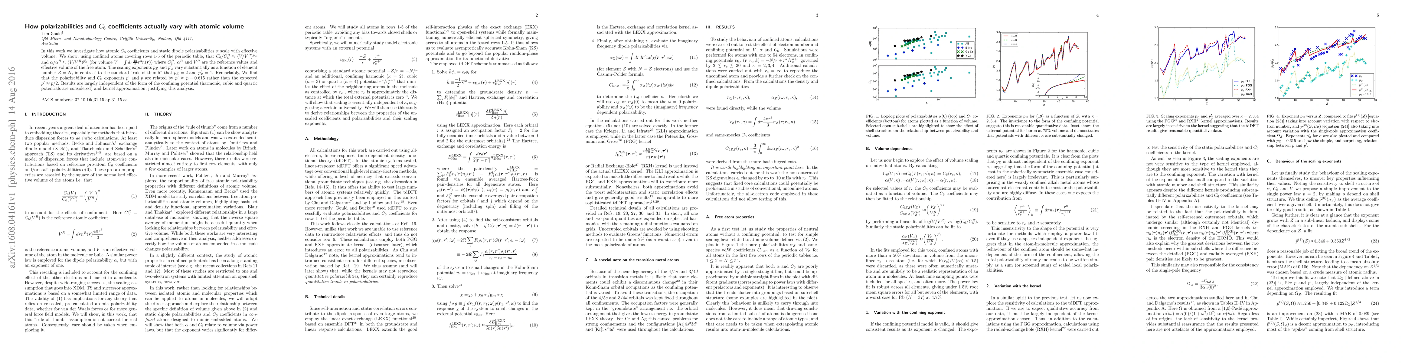 In this work we investigate how atomic $C_6$ coefficients and static dipole polarizabilities $\alpha$ scale with effective volume. We show, using confined atoms covering rows 1-5 of the periodic table, that $C_6/C_6^R\approx (V/V^R)^{p_Z}$ and $\alpha/\alpha^R\approx (V/V^R)^{p'_Z}$ (for volume $V=\int dr \frac{4\pi}{3}r^3 n(r)$) where $C_6^R$, $\alpha^R$ and $V^R$ are the reference values and effective volume of the free atom. The scaling exponents $p_Z$ and $p'_Z$ vary substantially as a function of element number $Z=N$, in contrast to the standard "rule of thumb" that $p_Z=2$ and $p'_Z=1$. Remarkably, We find that the polarizability and $C_6$ exponents $p'$ and $p$ are related by $p'\approx p-0.615$ rather than the expected $p'\approx p/2$. Results are largely independent of the form of the confining potential (harmonic, cubic and quartic potentials are considered) and kernel approximation, justifying this analysis.
