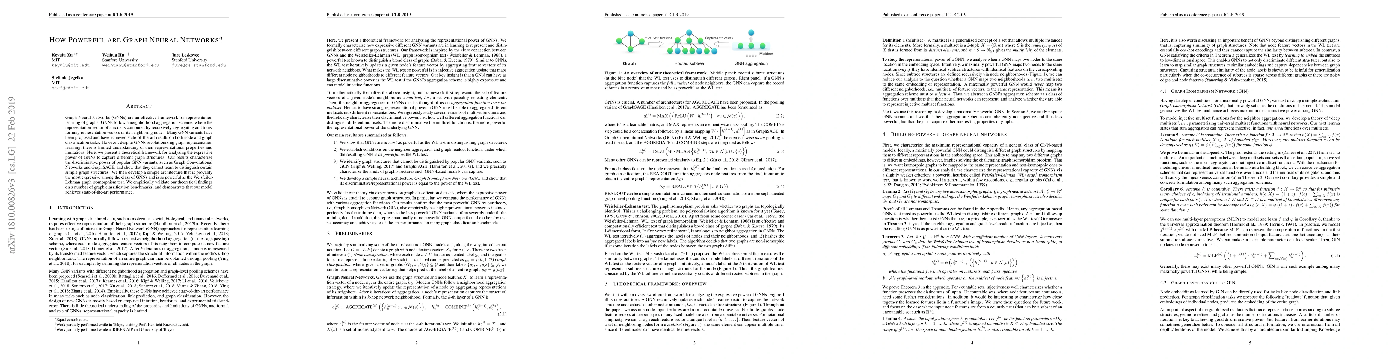 Graph Neural Networks (GNNs) are an effective framework for representation learning of graphs. GNNs follow a neighborhood aggregation scheme, where the representation vector of a node is computed by recursively aggregating and transforming representation vectors of its neighboring nodes. Many GNN variants have been proposed and have achieved state-of-the-art results on both node and graph classification tasks. However, despite GNNs revolutionizing graph representation learning, there is limited understanding of their representational properties and limitations. Here, we present a theoretical framework for analyzing the expressive power of GNNs to capture different graph structures. Our results characterize the discriminative power of popular GNN variants, such as Graph Convolutional Networks and GraphSAGE, and show that they cannot learn to distinguish certain simple graph structures. We then develop a simple architecture that is provably the most expressive among the class of GNNs and is as powerful as the Weisfeiler-Lehman graph isomorphism test. We empirically validate our theoretical findings on a number of graph classification benchmarks, and demonstrate that our model achieves state-of-the-art performance.