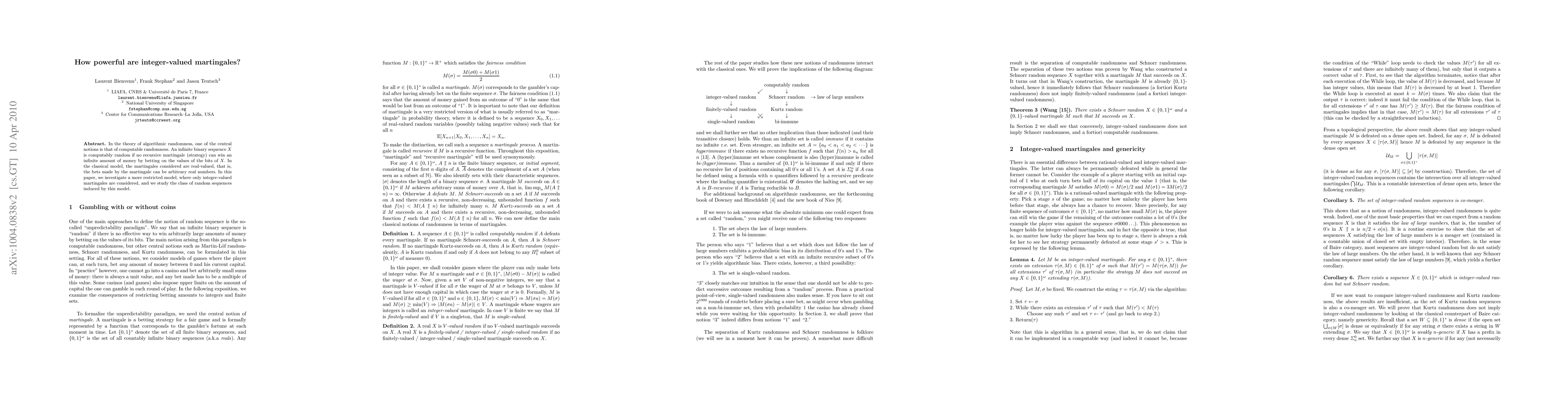 This paper investigates the power of integer-valued martingales in a restricted model used to study algorithmic randomness, finding that they can induce a broader class of random sequences than real-valued martingales.