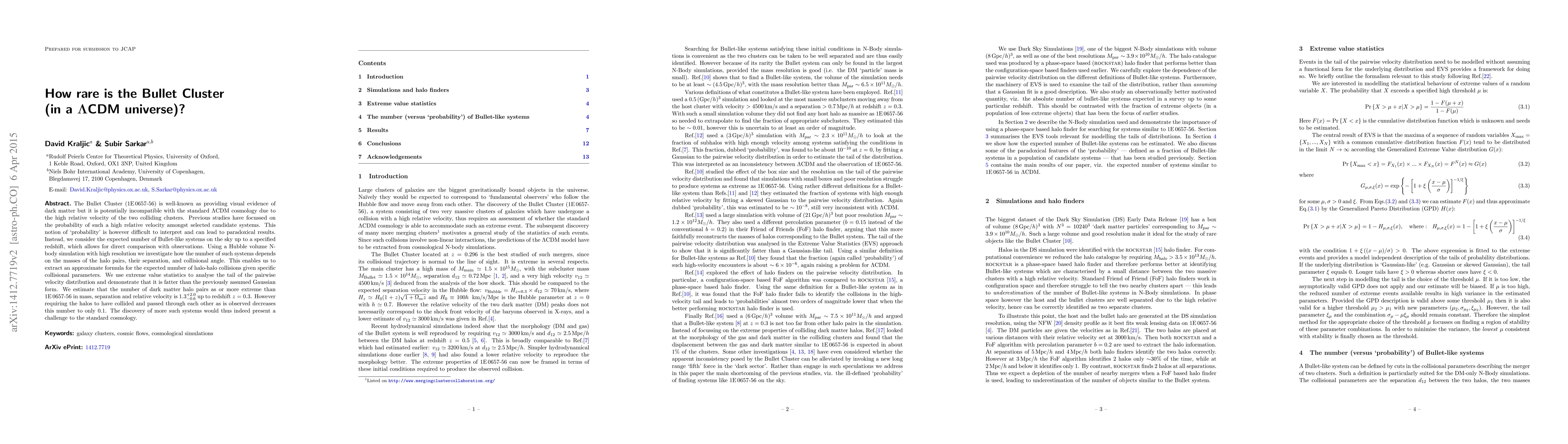 The Bullet Cluster is rare in the $\Lambda$CDM universe, with an estimated number of similarly extreme systems up to redshift $z=0.3$ being $1.3^{+2.0}_{-0.6}$. However, considering only those that have collided and passed through each other, the count drops to just 0.1, posing a challenge to standard cosmology.