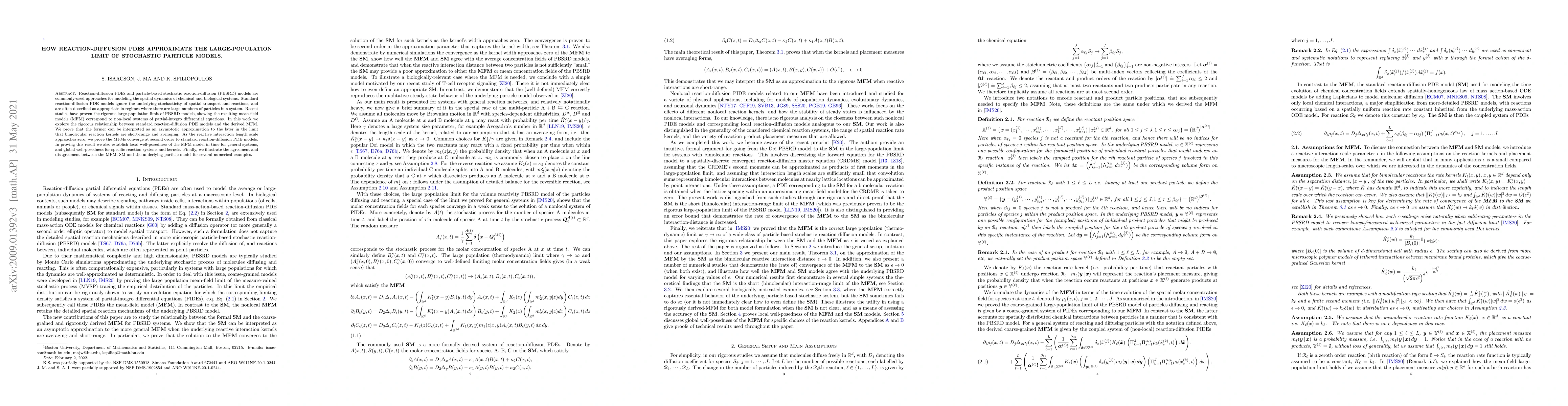 This paper investigates the relationship between reaction-diffusion PDEs and stochastic particle models, proving that the former approximates the latter in the large-population limit when reaction kernels are short-range. It also establishes well-posedness for the stochastic model and compares numerical results between the two approaches.