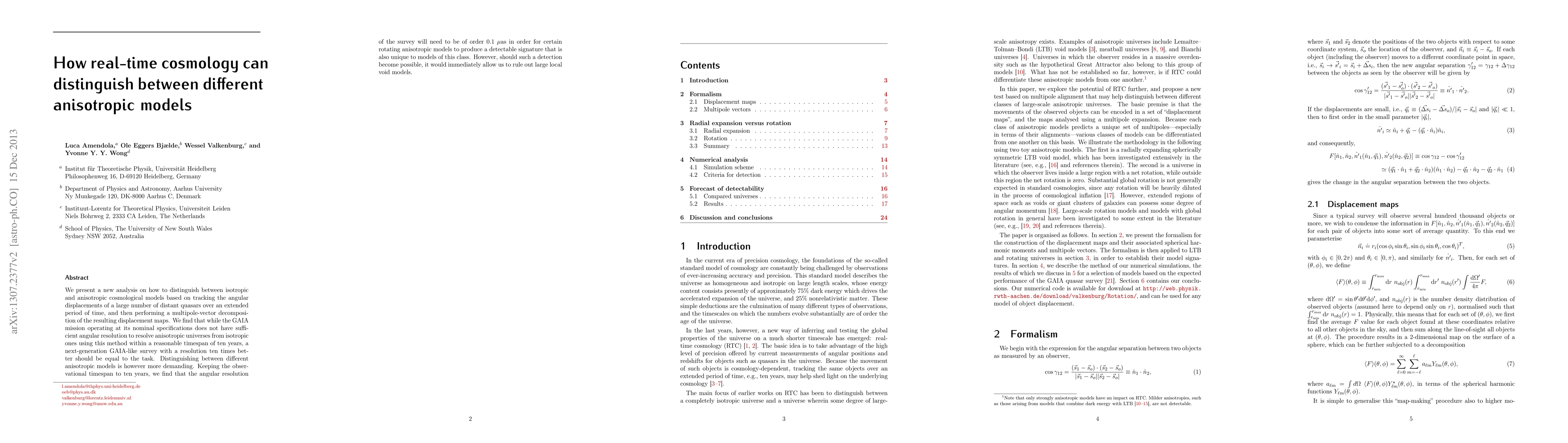 This paper explores how real-time cosmology can differentiate between isotropic and anisotropic cosmological models by tracking quasar displacements over time. While current GAIA missions lack resolution, a next-generation survey with ten times better resolution could distinguish isotropic from anisotropic models within ten years, but a resolution of 0.1 micro-arcseconds is needed to detect and uniquely identify rotating anisotropic models.