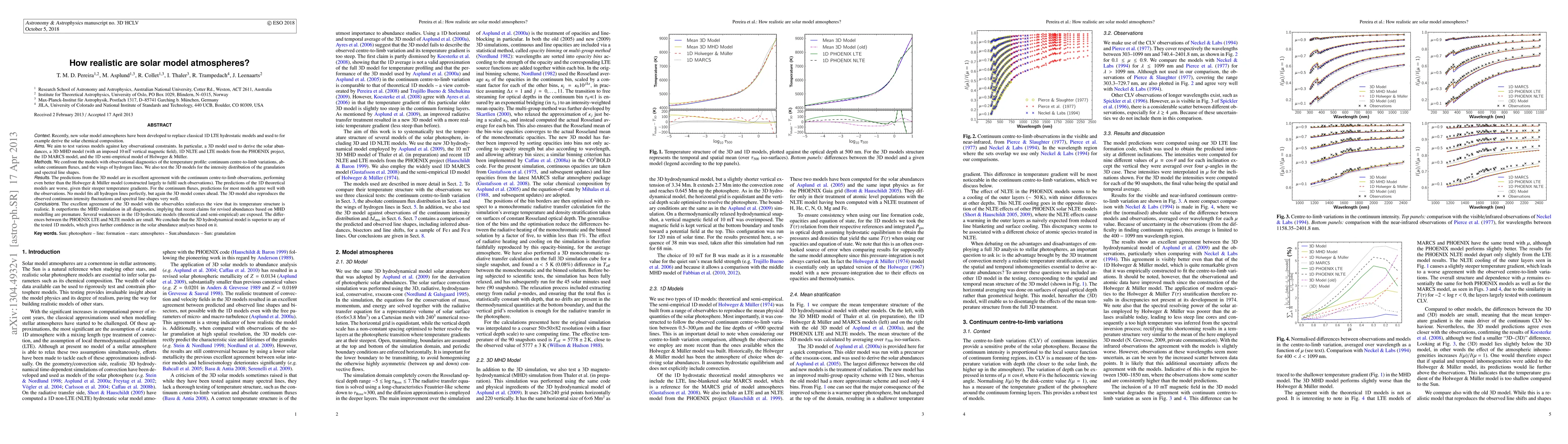Researchers tested various solar model atmospheres against observational constraints, finding that a 3D hydrodynamical model outperforms traditional 1D models in replicating temperature profiles, continuum fluxes, and spectral line shapes, providing further confidence in its realism and implications for solar abundance analyses.