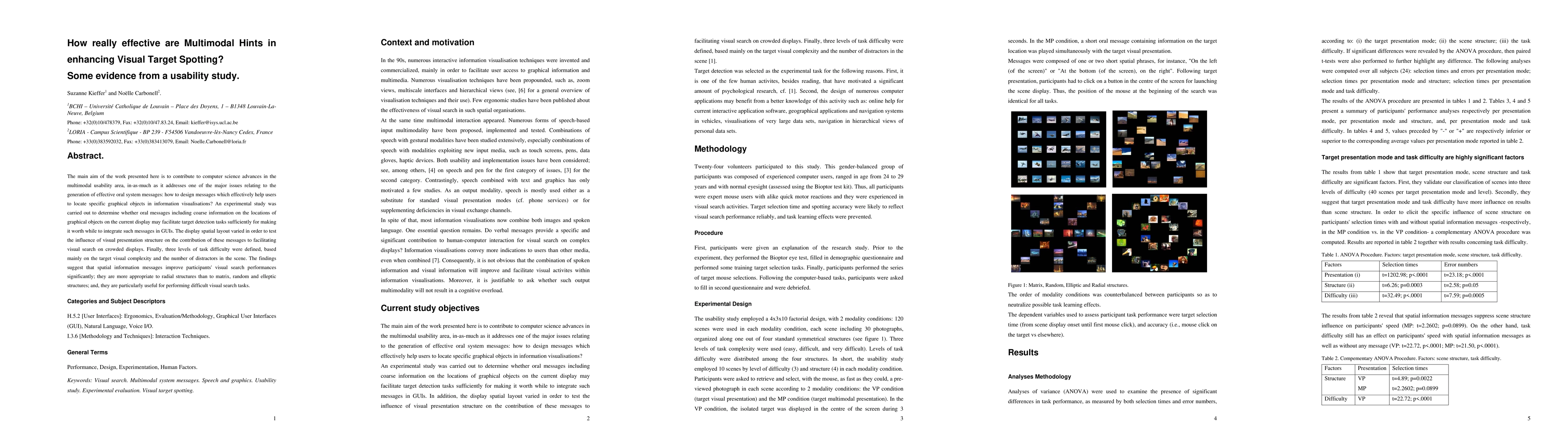 The main aim of the work presented here is to contribute to computer science advances in the multimodal usability area, in-as-much as it addresses one of the major issues relating to the generation of effective oral system messages: how to design messages which effectively help users to locate specific graphical objects in information visualisations? An experimental study was carried out to determine whether oral messages including coarse information on the locations of graphical objects on the current display may facilitate target detection tasks sufficiently for making it worth while to integrate such messages in GUIs. The display spatial layout varied in order to test the influence of visual presentation structure on the contribution of these messages to facilitating visual search on crowded displays. Finally, three levels of task difficulty were defined, based mainly on the target visual complexity and the number of distractors in the scene. The findings suggest that spatial information messages improve participants' visual search performances significantly; they are more appropriate to radial structures than to matrix, random and elleptic structures; and, they are particularly useful for performing difficult visual search tasks.