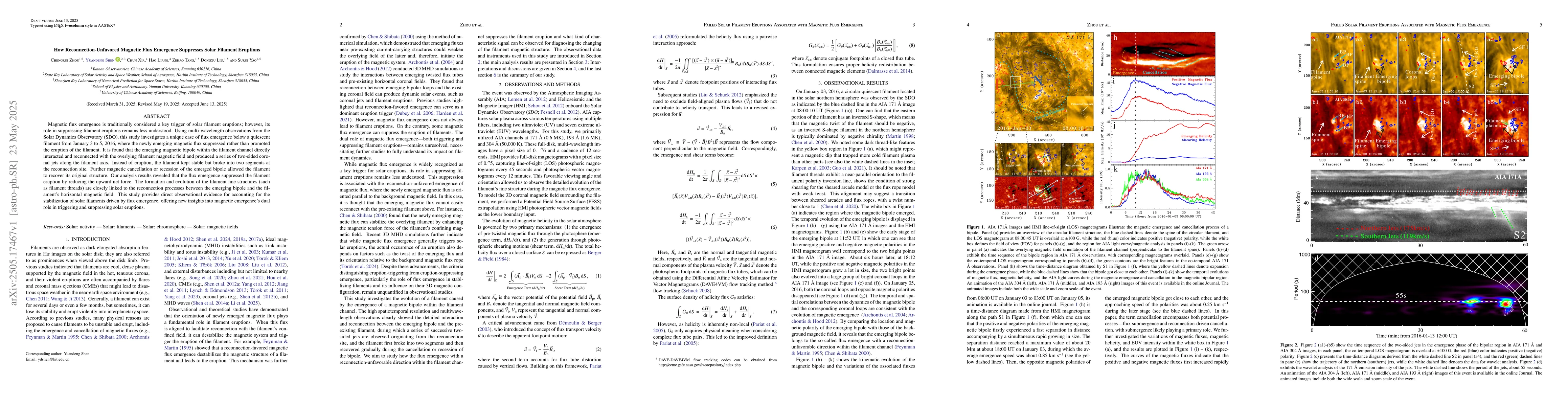 The paper presents an in-depth analysis of observational data from the Solar Dynamics Observatory, revealing the suppressive role of magnetic flux emergence on solar filament eruptions through reconnection processes.