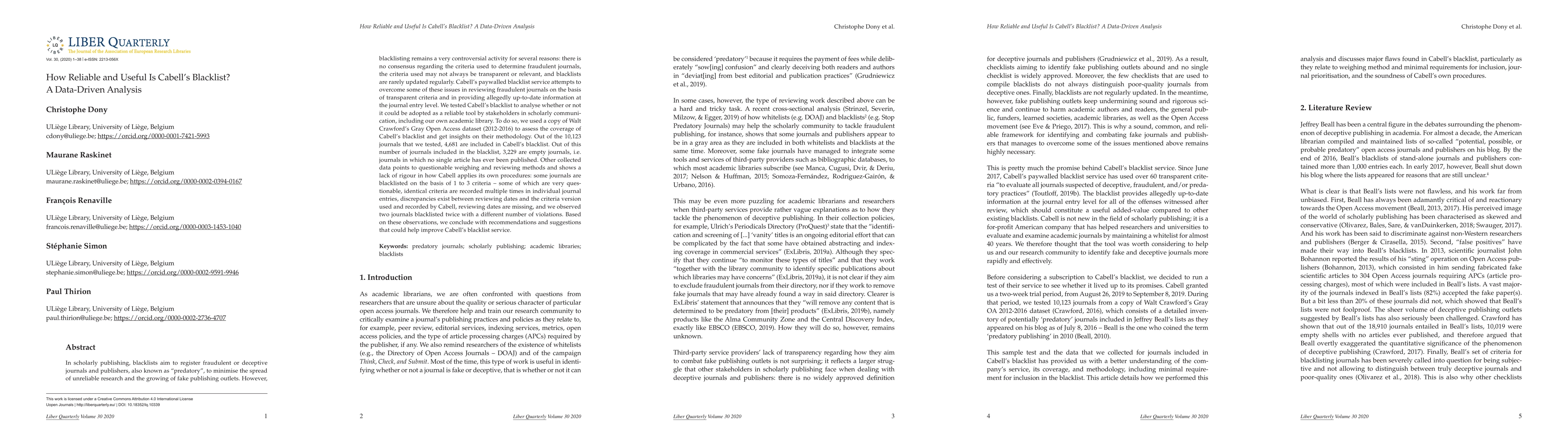 In scholarly publishing, blacklists aim to register fraudulent or deceptive journals and publishers, also known as "predatory", to minimise the spread of unreliable research and the growing of fake publishing outlets. However, blacklisting remains a very controversial activity for several reasons: there is no consensus regarding the criteria used to determine fraudulent journals, the criteria used may not always be transparent or relevant, and blacklists are rarely updated regularly. Cabell's paywalled blacklist service attempts to overcome some of these issues in reviewing fraudulent journals on the basis of transparent criteria and in providing allegedly up-to-date information at the journal entry level. We tested Cabell's blacklist to analyse whether or not it could be adopted as a reliable tool by stakeholders in scholarly communication, including our own academic library. To do so, we used a copy of Walt Crawford's Gray Open Access dataset (2012-2016) to assess the coverage of Cabell's blacklist and get insights on their methodology. Out of the 10,123 journals that we tested, 4,681 are included in Cabell's blacklist. Out of this number of journals included in the blacklist, 3,229 are empty journals, i.e. journals in which no single article has ever been published. Other collected data points to questionable weighing and reviewing methods and shows a lack of rigour in how Cabell applies its own procedures: some journals are blacklisted on the basis of 1 to 3 criteria, identical criteria are recorded multiple times in individual journal entries, discrepancies exist between reviewing dates and the criteria version used and recorded by Cabell, reviewing dates are missing, and we observed two journals blacklisted twice with a different number of violations. Based on these observations, we conclude with recommendations and suggestions that could help improve Cabell's blacklist service.