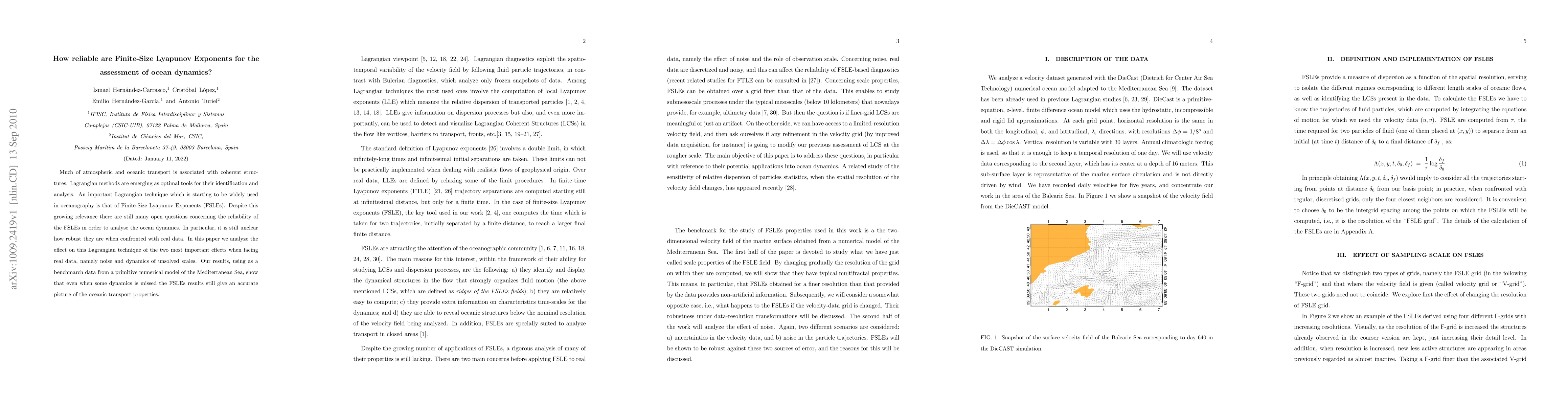 This paper investigates the reliability of Finite-Size Lyapunov Exponents (FSLEs) for analyzing ocean dynamics, focusing on their robustness against noise and unresolved scales in real data. The study finds that FSLEs provide an accurate depiction of oceanic transport properties despite some missed dynamics.