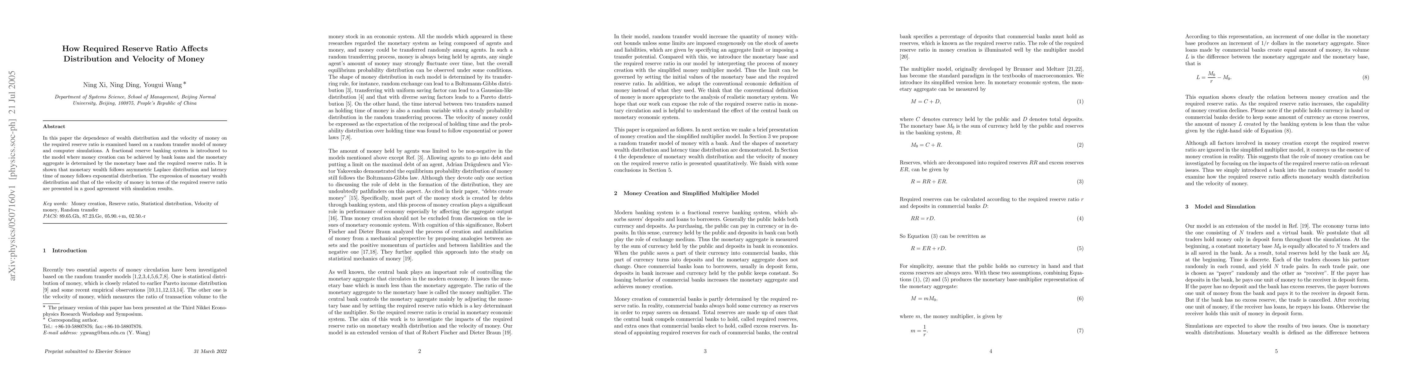 The work is novel by explicitly linking the required reserve ratio to both wealth distribution and velocity of money using a random transfer model and computer simulations.