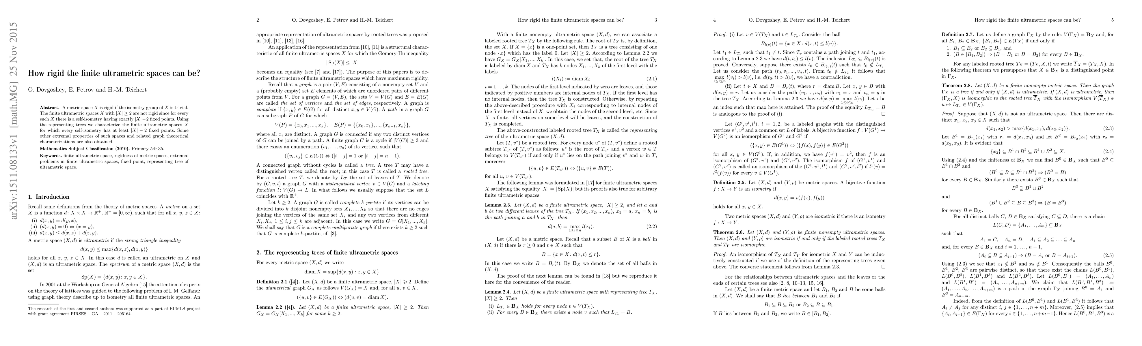 This paper explores the rigidity of finite ultrametric spaces, showing they are not rigid due to non-trivial isometry groups. It characterizes ultrametric spaces where every self-isometry has at least $|X|-2$ fixed points using representing trees and discusses related graph theoretical properties.
