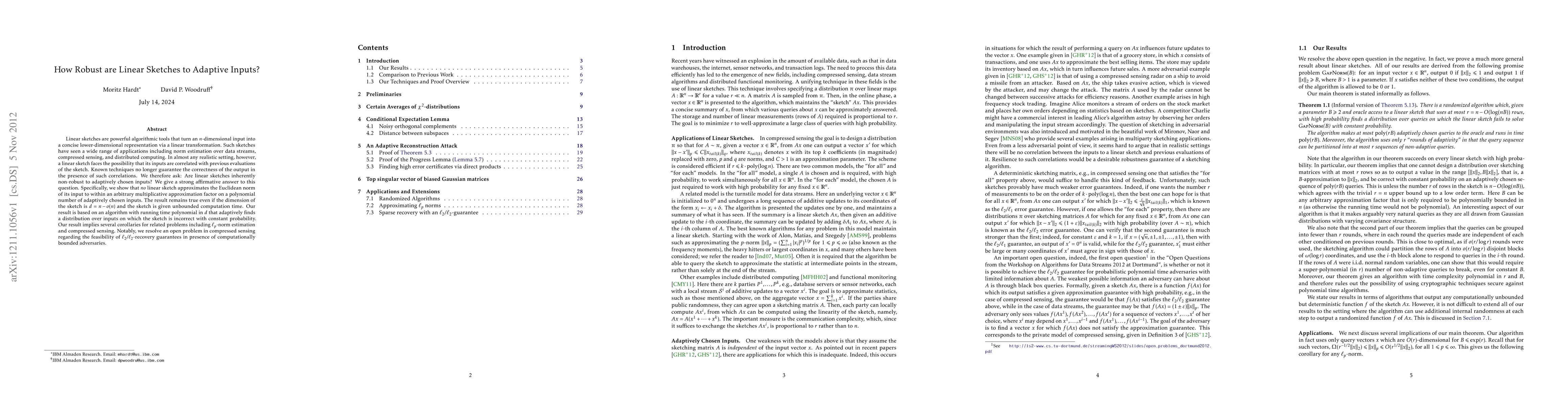 This paper demonstrates that linear sketches are not robust to adaptively chosen inputs, showing that no linear sketch can approximate the Euclidean norm accurately on a polynomial number of adaptively selected inputs, even with high dimensionality and unbounded computation time. The findings resolve an open problem in compressed sensing regarding the feasibility of l2/l2-recovery guarantees under adversarial conditions.