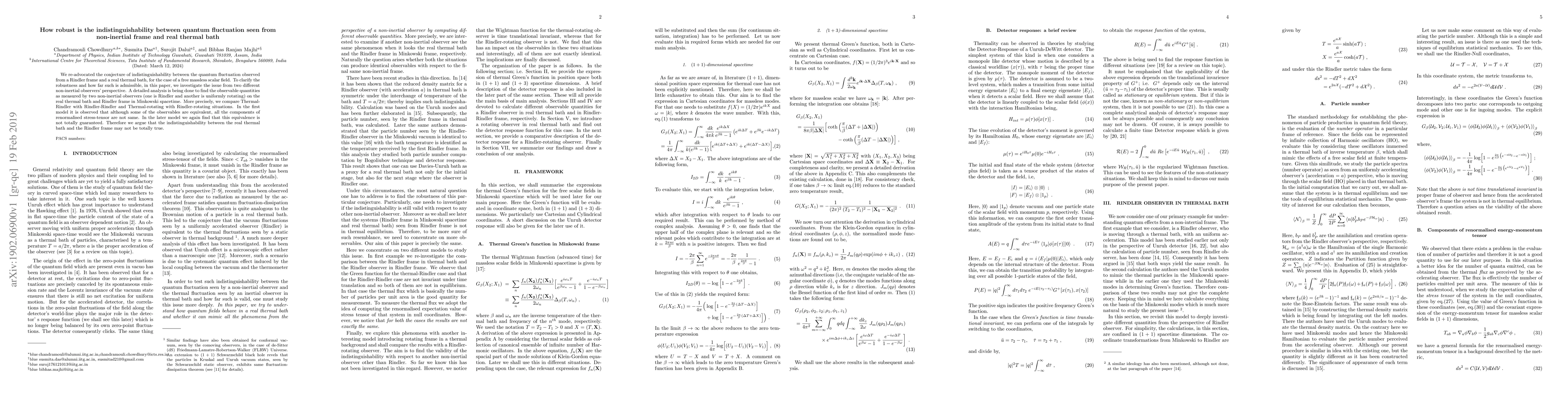 We re-advocated the conjecture of indistinguishability between the quantum fluctuation observed from a Rindler frame and a real thermal bath, for the case of a free massless scalar field. To clarify the robustness and how far such is admissible, in this paper, we investigate the issue from two different non-inertial observers' perspective. A detailed analysis is being done to find the observable quantities as measured by two non-inertial observers (one is Rindler and another is uniformly rotating) on the real thermal bath and Rindler frame in Minkowski spacetime. More precisely, we compare Thermal-Rindler with Rindler-Rindler and Thermal-rotating with Rindler-rotating situations. In the first model it is observed that although some of the observables are equivalent, all the components of renormalised stress-tensor are not the same. In the later model, we again find that this equivalence is not totally guaranteed. Therefore we argue that the indistinguishability between the real thermal bath and the Rindler frame may not be totally true.