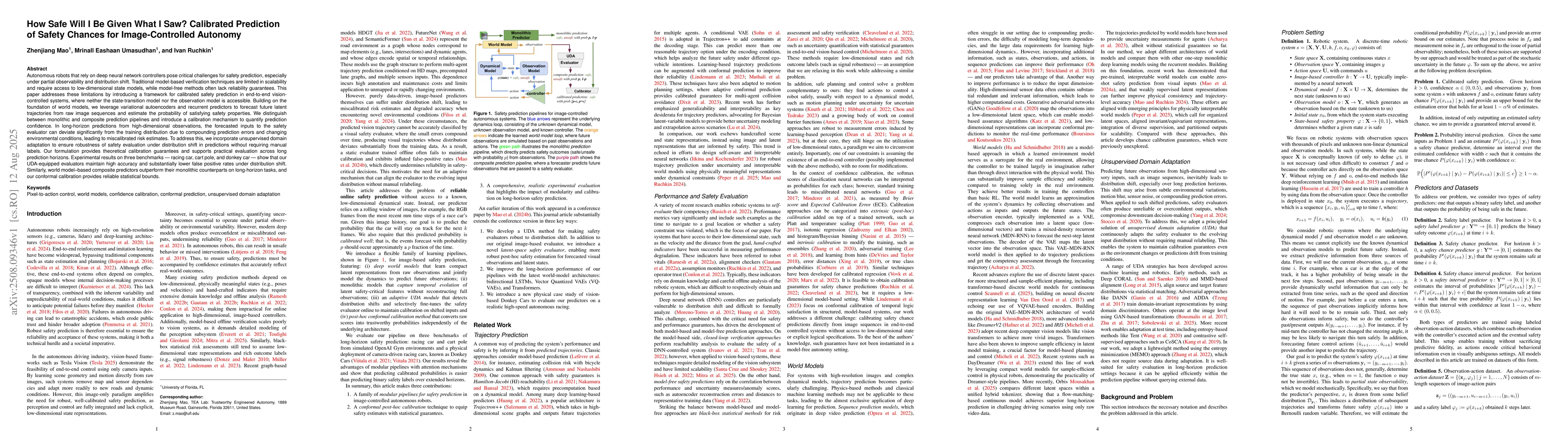 Autonomous robots that rely on deep neural network controllers pose critical challenges for safety prediction, especially under partial observability and distribution shift. Traditional model-based verification techniques are limited in scalability and require access to low-dimensional state models, while model-free methods often lack reliability guarantees. This paper addresses these limitations by introducing a framework for calibrated safety prediction in end-to-end vision-controlled systems, where neither the state-transition model nor the observation model is accessible. Building on the foundation of world models, we leverage variational autoencoders and recurrent predictors to forecast future latent trajectories from raw image sequences and estimate the probability of satisfying safety properties. We distinguish between monolithic and composite prediction pipelines and introduce a calibration mechanism to quantify prediction confidence. In long-horizon predictions from high-dimensional observations, the forecasted inputs to the safety evaluator can deviate significantly from the training distribution due to compounding prediction errors and changing environmental conditions, leading to miscalibrated risk estimates. To address this, we incorporate unsupervised domain adaptation to ensure robustness of safety evaluation under distribution shift in predictions without requiring manual labels. Our formulation provides theoretical calibration guarantees and supports practical evaluation across long prediction horizons. Experimental results on three benchmarks show that our UDA-equipped evaluators maintain high accuracy and substantially lower false positive rates under distribution shift. Similarly, world model-based composite predictors outperform their monolithic counterparts on long-horizon tasks, and our conformal calibration provides reliable statistical bounds.