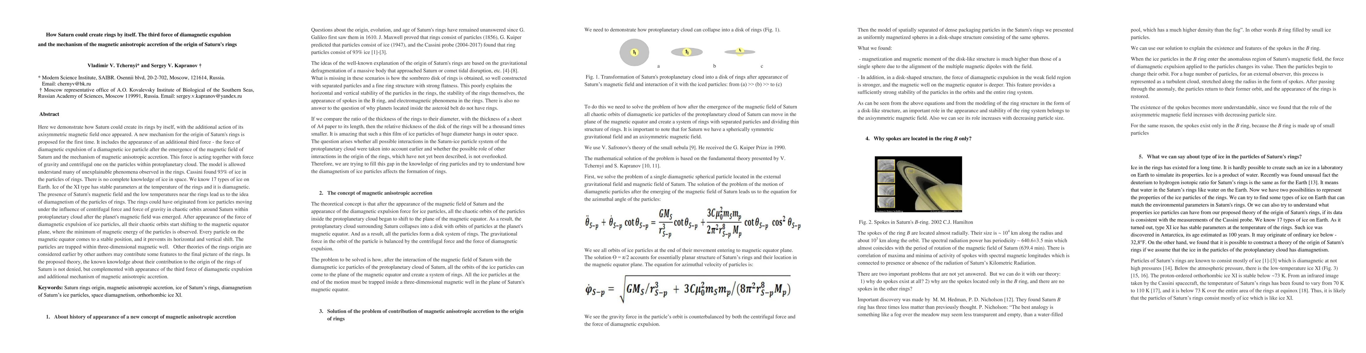 Here we demonstrate how Saturn could create its rings by itself, with the additional action of its axisymmetric magnetic field once appeared. A new mechanism for the origin of Saturn's rings is proposed for the first time. It includes the appearance of an additional third force - the force of diamagnetic expulsion of a diamagnetic ice particle after the emergence of the magnetic field of Saturn and the mechanism of magnetic anisotropic accretion. This force is acting together with force of gravity and centrifugal one on the particles within protoplanetary cloud. After appearance of the force of diamagnetic expulsion of ice particles, all their chaotic orbits start shifting to the magnetic equator plane, where the minimum of magnetic energy of the particles is observed. Every particle on the magnetic equator comes to a stable position, and it prevents its horizontal and vertical shift. The particles are trapped within three-dimensional magnetic well.