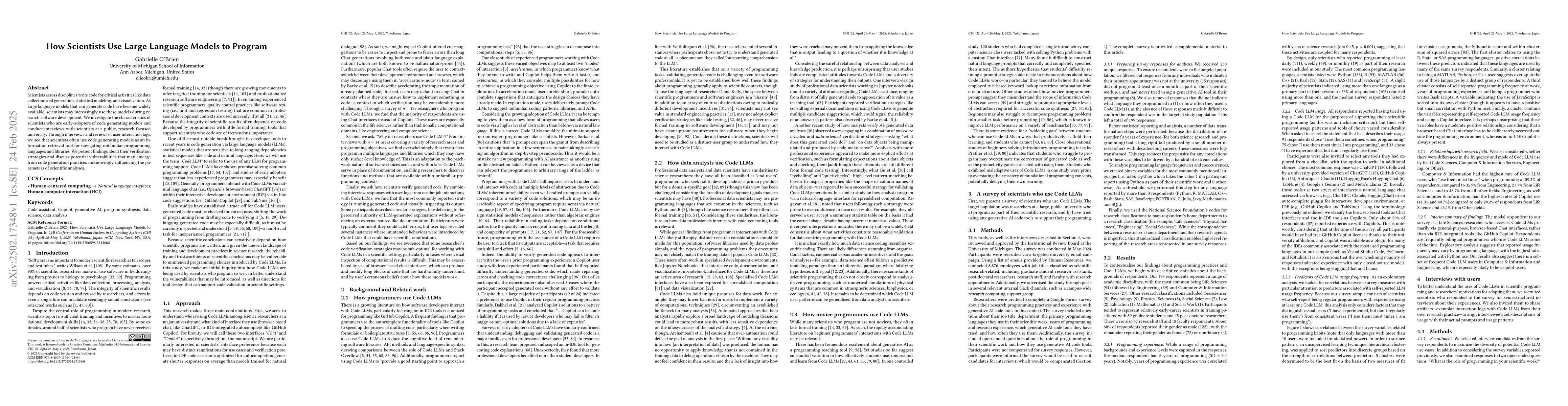 Scientists are increasingly using large language models to generate code for tasks like data collection and visualization. Early adopters utilize these models primarily to navigate unfamiliar programming languages and libraries, often verifying generated code through informal strategies. The study highlights potential vulnerabilities where code generation could inadvertently affect scientific analysis parameters.
