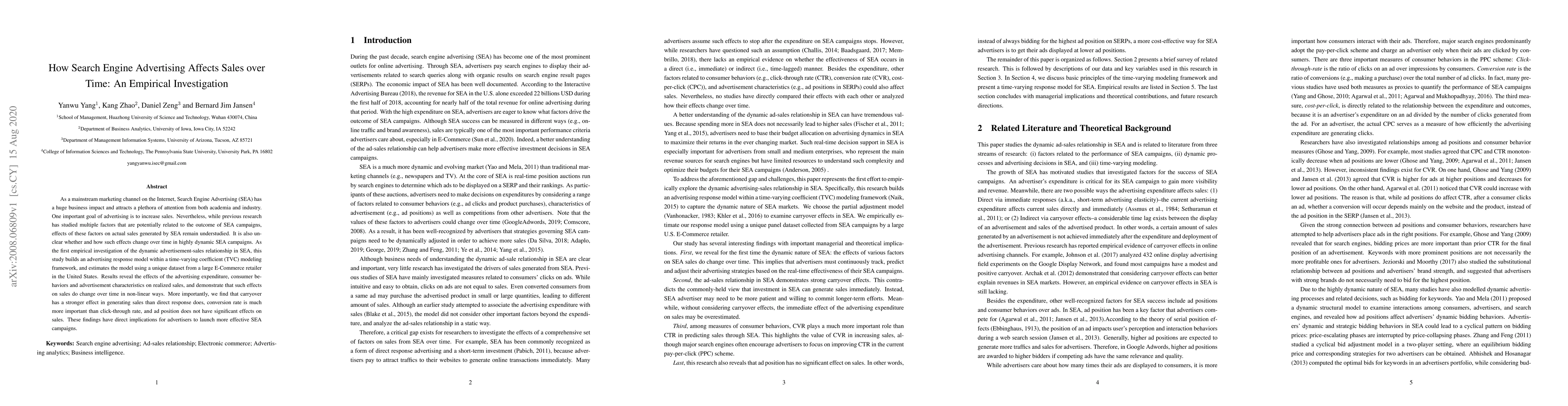 This study investigates how Search Engine Advertising (SEA) influences sales over time using a unique dataset from a large U.S. E-Commerce retailer. It finds that SEA effects on sales change non-linearly over time, with carryover effects being more significant than direct response, and conversion rate more impactful than click-through rate.