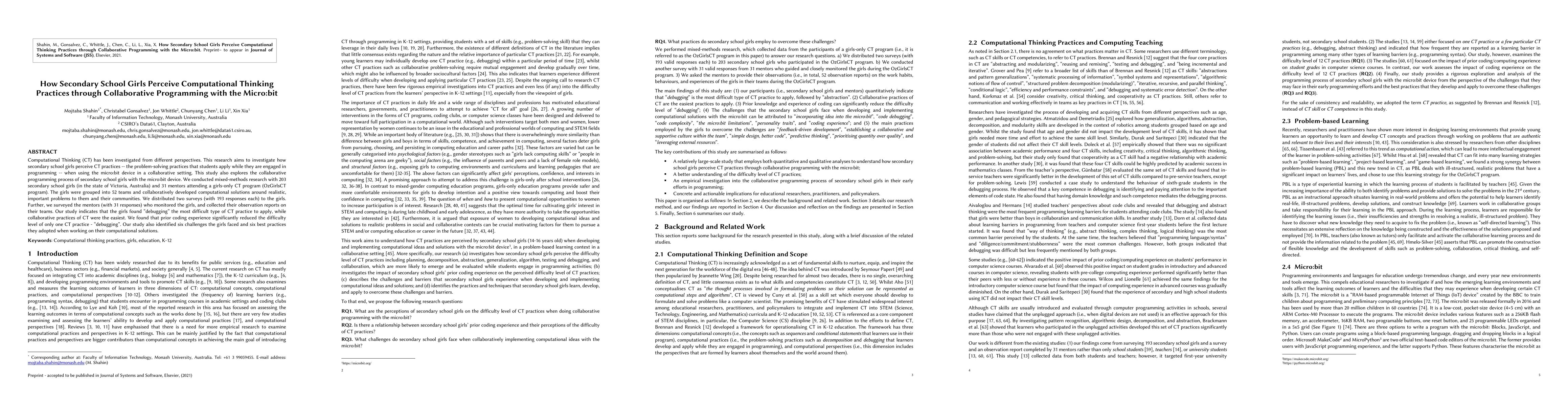 This study explores secondary school girls' perceptions of computational thinking practices while collaboratively programming with the micro:bit device in a girls-only program. The research found that "debugging" was the most challenging practice, while collaborative practices were easiest, and prior coding experience eased the difficulty of "debugging".