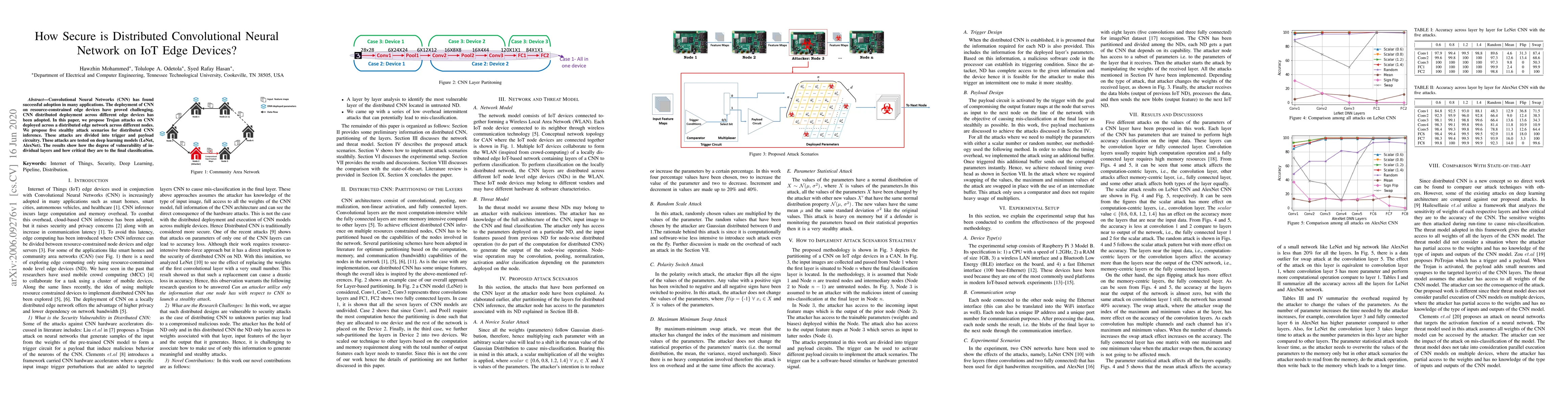 This paper investigates the security of distributed Convolutional Neural Networks (CNN) on IoT edge devices, proposing Trojan attacks across a distributed network. The study evaluates five stealthy attack scenarios, revealing vulnerabilities in individual layers and their impact on final classification using models like LeNet and AlexNet.