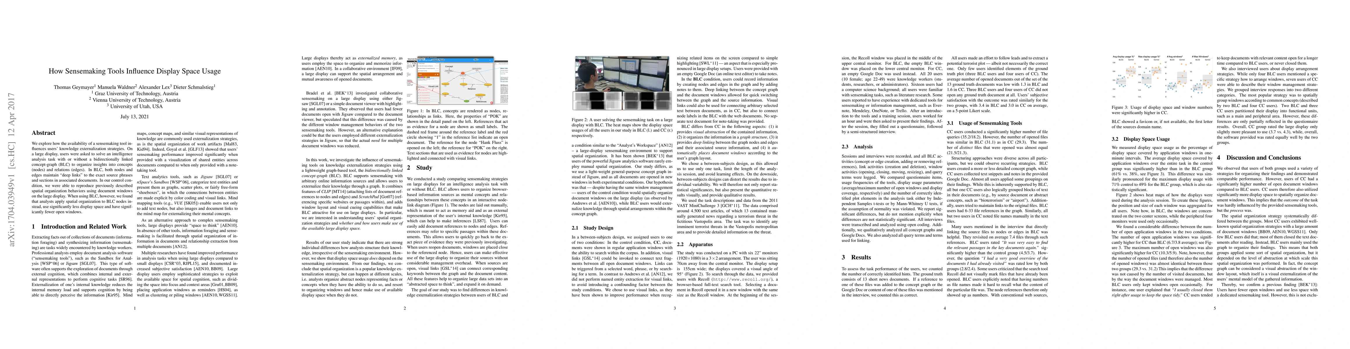 Using a sensemaking tool with concept-graphs reduced display space usage by half compared to traditional document windows, while organizing insights into concepts and relations.