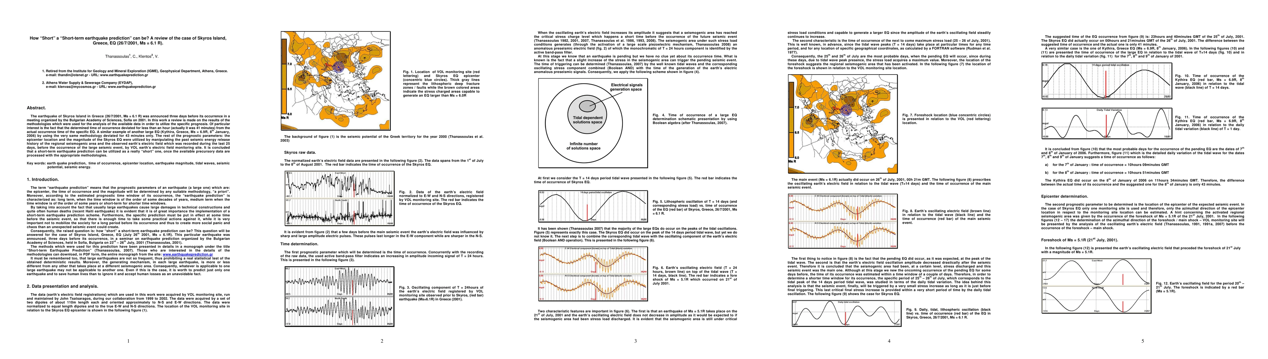 The earthquake of Skyros Island in Greece (26/7/2001, Ms = 6.1 R) was announced three days before its occurrence in a meeting organized by the Bulgarian Academy of Sciences, Sofia on 2001. In this work a review is made on the results of the methodologies which were used for the analysis of the available data in order to utilize the specific prognosis. Of particular interest is the fact that the determined time of occurrence deviated for less than an hour (actually it was 41 minutes) from the actual occurrence time of the specific EQ. A similar example of another large EQ (Kythira, Greece, Ms = 6.9R, 8th January, 2006) by using the very same methodology deviated for 43 minutes only. The rest of the prognostic parameters: the epicenter location and the magnitude of the Skyros EQ were utilized by manipulating the past seismic energy release history of the regional seismogenic area and the observed earth's electric field which was recorded during the last 25 days, before the occurrence of the large seismic event, by VOL earth's electric field monitoring site. It is concluded that a short-term earthquake prediction can be utilized as a really "short" one, once the available precursory data are processed with the appropriate methodologies.