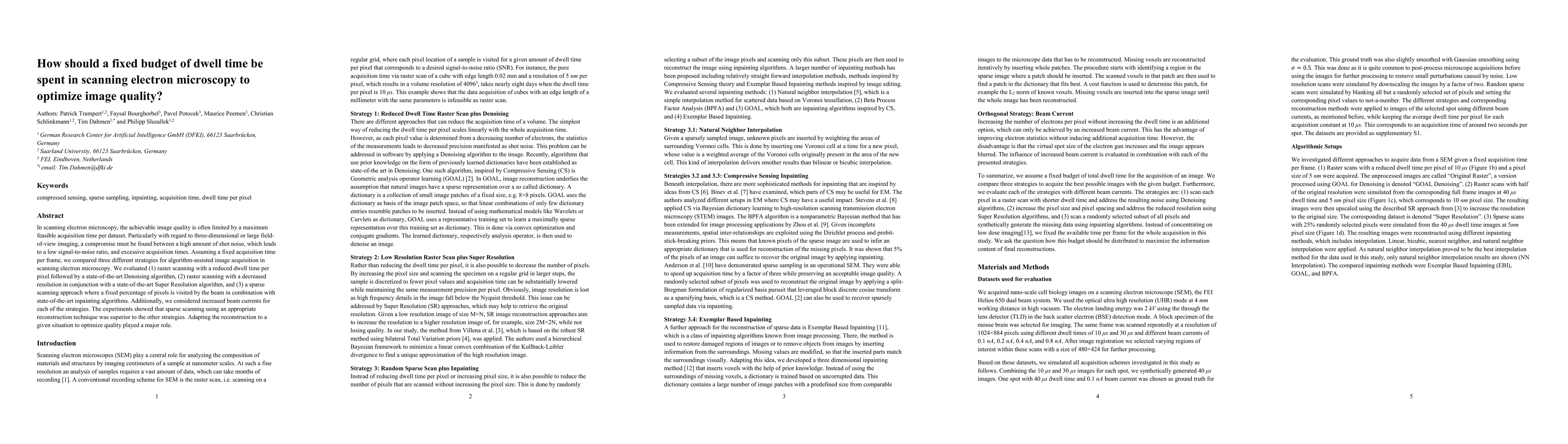 In scanning electron microscopy, the achievable image quality is often limited by a maximum feasible acquisition time per dataset. Particularly with regard to three-dimensional or large field-of-view imaging, a compromise must be found between a high amount of shot noise, which leads to a low signal-to-noise ratio, and excessive acquisition times. Assuming a fixed acquisition time per frame, we compared three different strategies for algorithm-assisted image acquisition in scanning electron microscopy. We evaluated (1) raster scanning with a reduced dwell time per pixel followed by a state-of-the-art Denoising algorithm, (2) raster scanning with a decreased resolution in conjunction with a state-of-the-art Super Resolution algorithm, and (3) a sparse scanning approach where a fixed percentage of pixels is visited by the beam in combination with state-of-the-art inpainting algorithms. Additionally, we considered increased beam currents for each of the strategies. The experiments showed that sparse scanning using an appropriate reconstruction technique was superior to the other strategies.