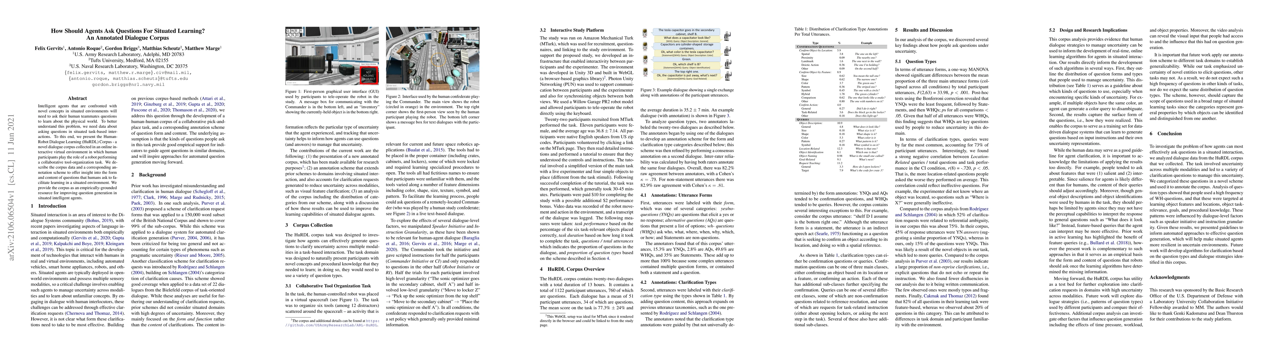 This paper introduces the HuRDL Corpus, a dataset of dialogues in a virtual environment where humans collaborate with a robot to organize tools. The corpus aims to provide insights into effective question-asking strategies for intelligent agents in situated learning scenarios, offering a resource for improving question generation in such contexts.